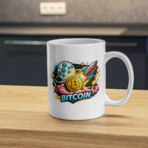 A bold Bitcoin mug celebrating the classic ‘to the moon’ crypto mindset.