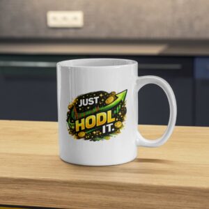 14,90 $A bold ceramic mug featuring the motivational crypto phrase “Just HODL It” with bullish charts and upward momentum. -