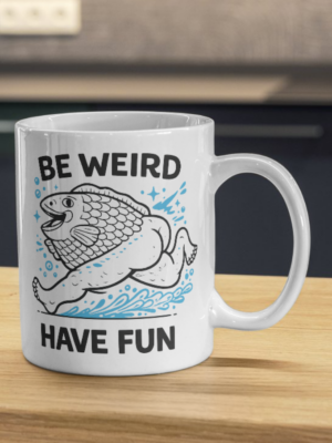 24,99 $Original price was: 24,99 $.16,99 $Current price is: 16,99 $.A playful and quirky design featuring a half-fish, half-human figure with the bold message: Be Weird Have Fun. -
