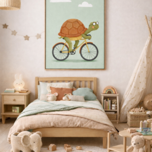 • Whimsical Turtle Bicycle Wall Art Print – Cute Animal Illustration for Nursery, Kids Room & Modern Home Decor