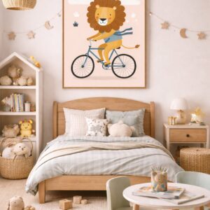 • Whimsical Lion Bicycle Wall Art Print – Cute Animal Illustration for Nursery, Kids Room & Modern Home Decor