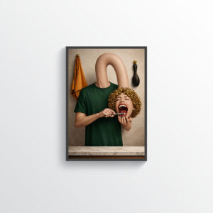 Surreal Morning Routine Wall Art Print – Absurd Conceptual Bathroom Illustration