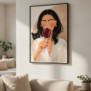 Wine & Whiskers – Elegant Woman With Cat Art Print