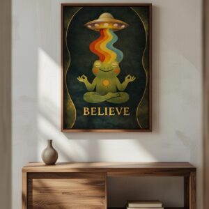 Meditating Frog UFO Art Print – Whimsical Cosmic Illustration