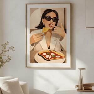 Woman Eating Pizza Art Print – Stylish Modern Lifestyle Illustration