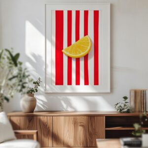 10,89 $Bold minimalist lemon slice artwork with striking red stripes, perfect for modern kitchens and playful interiors.