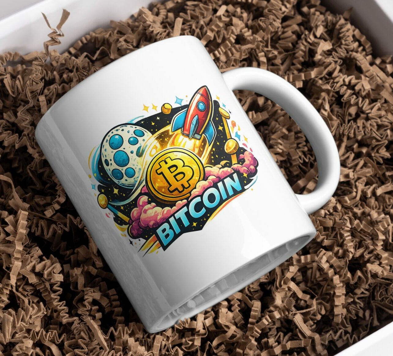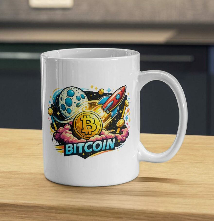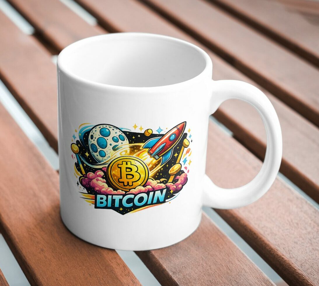 A bold Bitcoin mug celebrating the classic ‘to the moon’ crypto mindset.