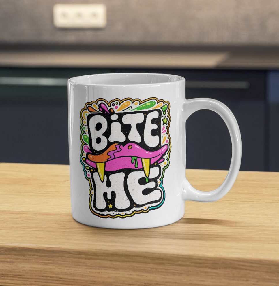 A vibrant pop-art inspired mug featuring bold “Bite Me” typography with playful street-style flair.