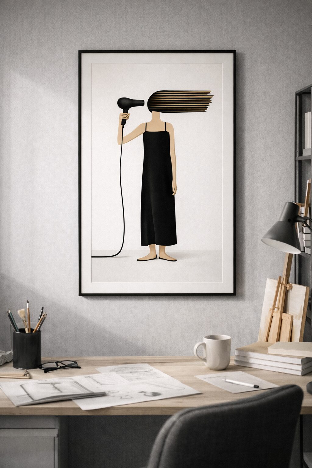 This artwork captures motion, identity, and modern femininity using extreme restraint. No face. No noise. Just shape, direction, and tension. It feels editorial, fashion-forward, and quietly rebellious.