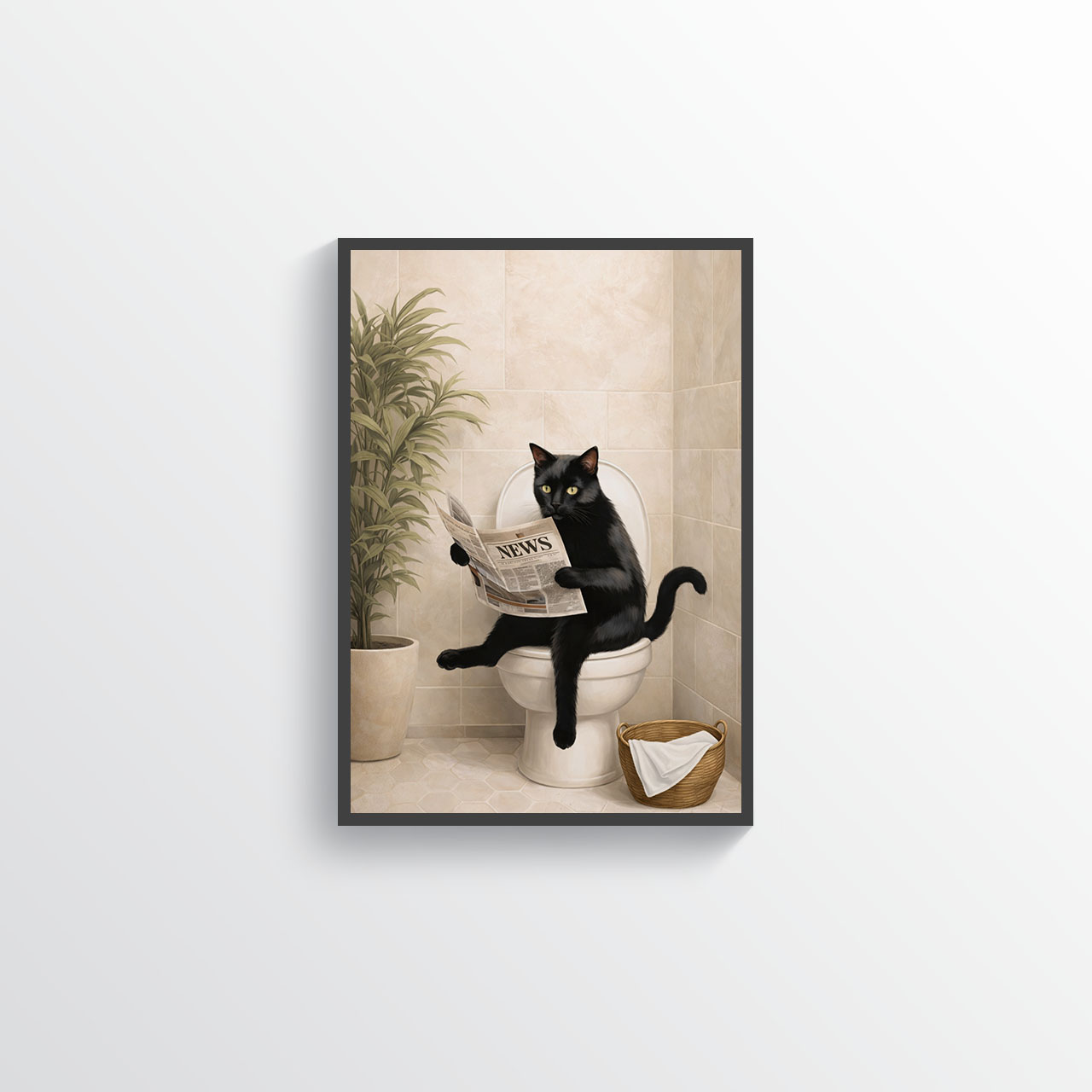 This dark-humor wall art print captures a black cat seated on a toilet, calmly reading the newspaper. The contrast between the composed posture and the absurd setting creates a piece that feels intentional, witty, and quietly confrontational.
