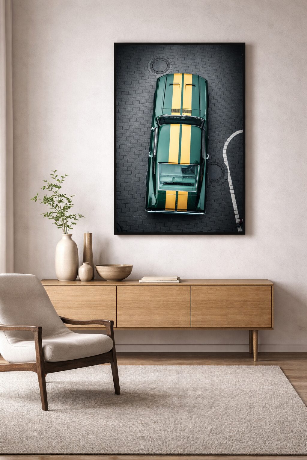 This artwork captures a classic American muscle silhouette from a clean, top-down perspective. Deep racing green paint, bold dual yellow stripes, and perfectly centered alignment turn a familiar automotive form into a graphic design statement. The overhead view strips away nostalgia fluff and leaves only proportion, symmetry, and intent.