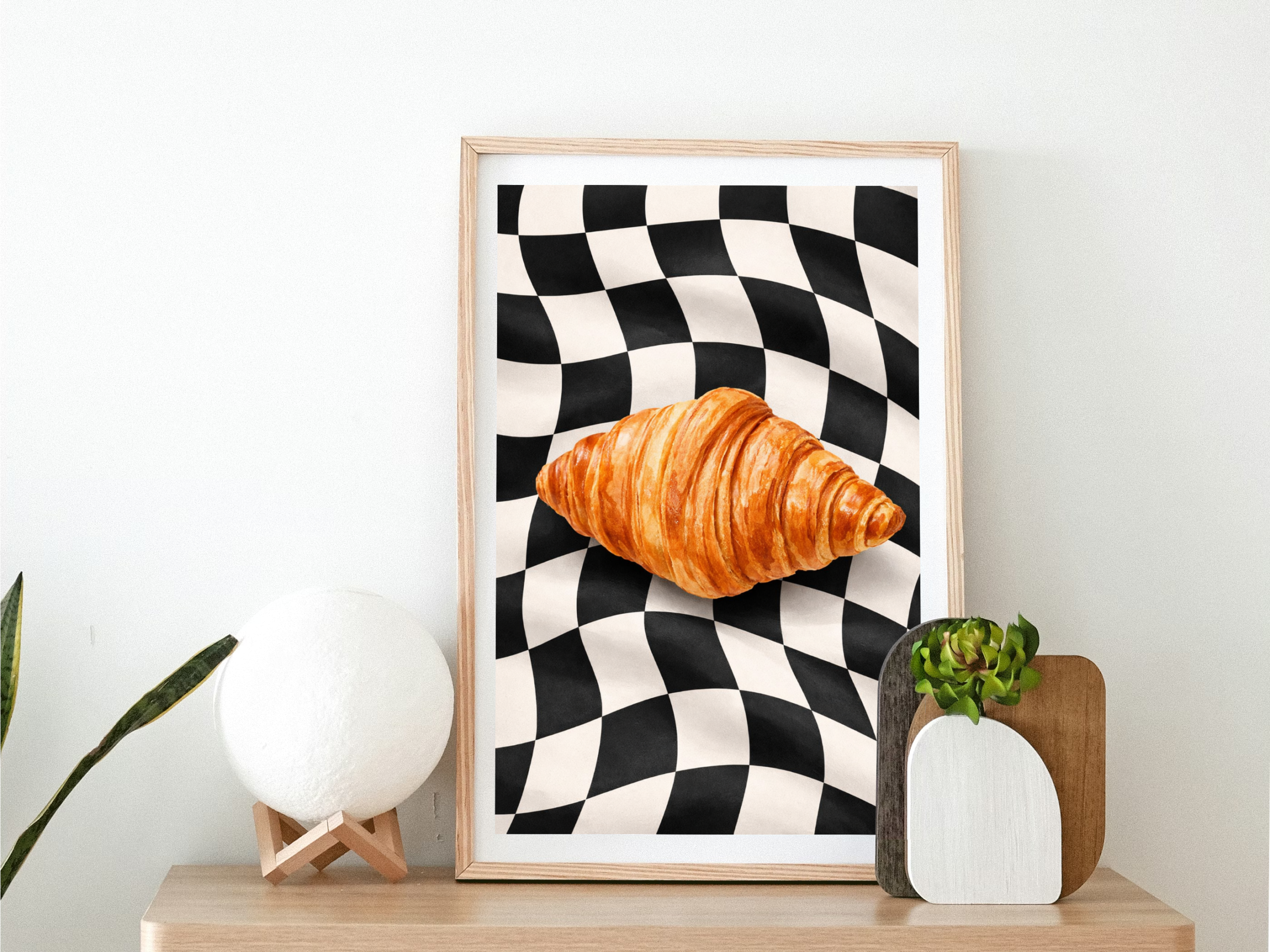 This modern food illustration turns a simple croissant into a visual statement. Set against a warped black-and-white checkerboard, the composition plays with perception, contrast, and rhythm.