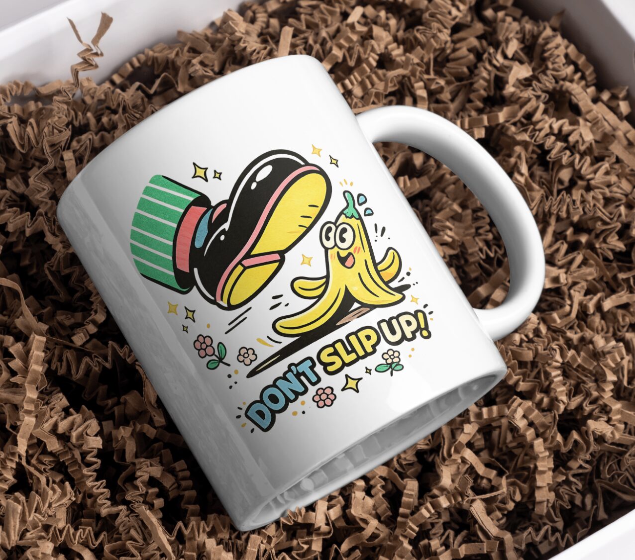 A cheerful banana peel character under a flying top hat with the playful reminder ‘Don’t Slip Up’. This humorous design adds fun energy to your morning coffee routine.