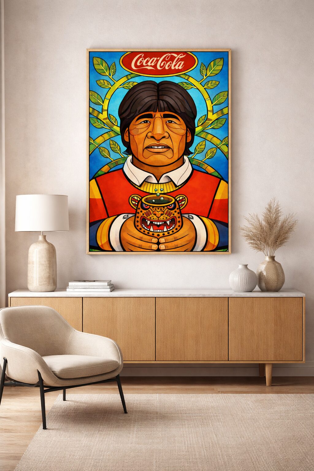 The presence of the Coca-Cola–style emblem functions as commentary rather than branding, highlighting the friction between globalization, capitalism, and indigenous identity. This is not celebration. It’s visual analysis. A political portrait designed to provoke thought, not agreement.