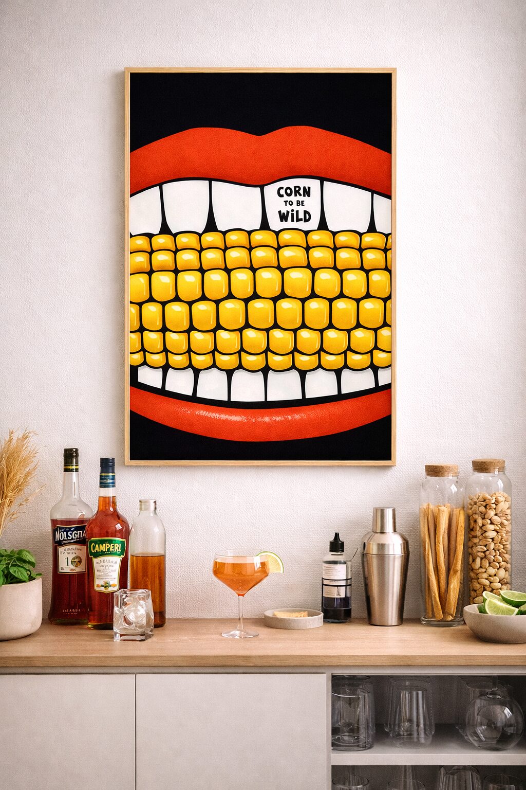 Zero shame. Maximum crunch. This bold wall art print features an oversized mouth biting straight into a perfectly stacked corn cob, with the phrase “Corn To Be Wild” stamped right where it belongs. High-contrast colors, exaggerated shapes, and pop-art energy turn a dumb pun into a powerful visual punch.