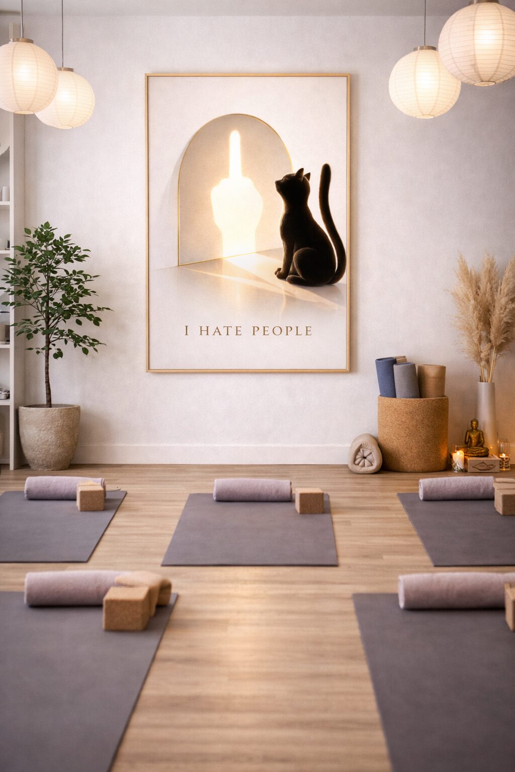Quietly hostile. Beautifully lit. This minimalist wall art print features a black cat seated in soft light, staring at a glowing archway that casts a blunt, unmistakable shadow. Beneath it, a simple truth in elegant type: “I Hate People.”