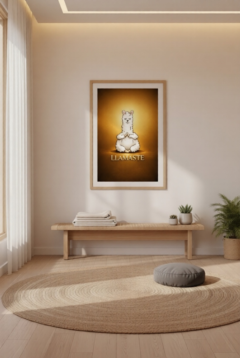This charming wall art features a serene llama sitting in a meditation pose, eyes closed, hands together, radiating calm under a warm golden glow. The word Llamaste grounds the piece with gentle humor, blending mindfulness culture with playful animal charm.