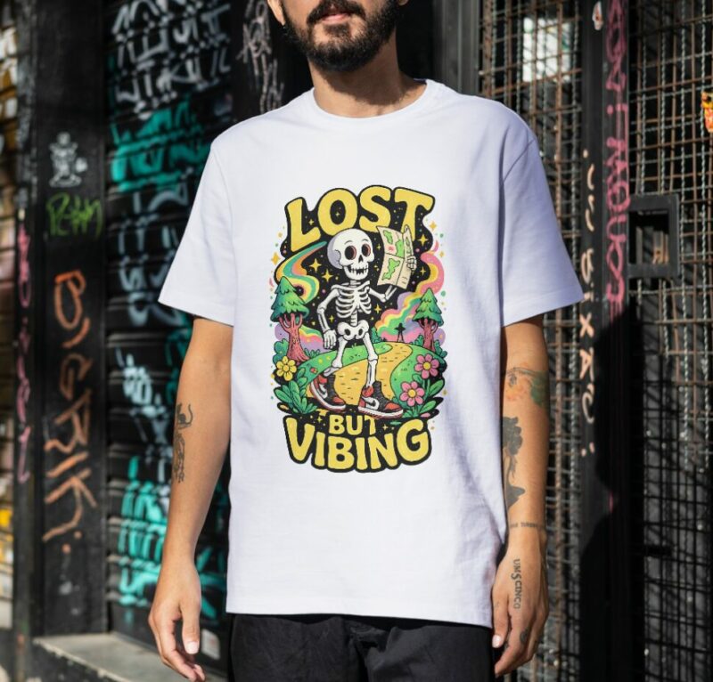 Wear the energy of Lost But Vibing as a clean, bold graphic on a comfortable cotton t-shirt made for daily life.