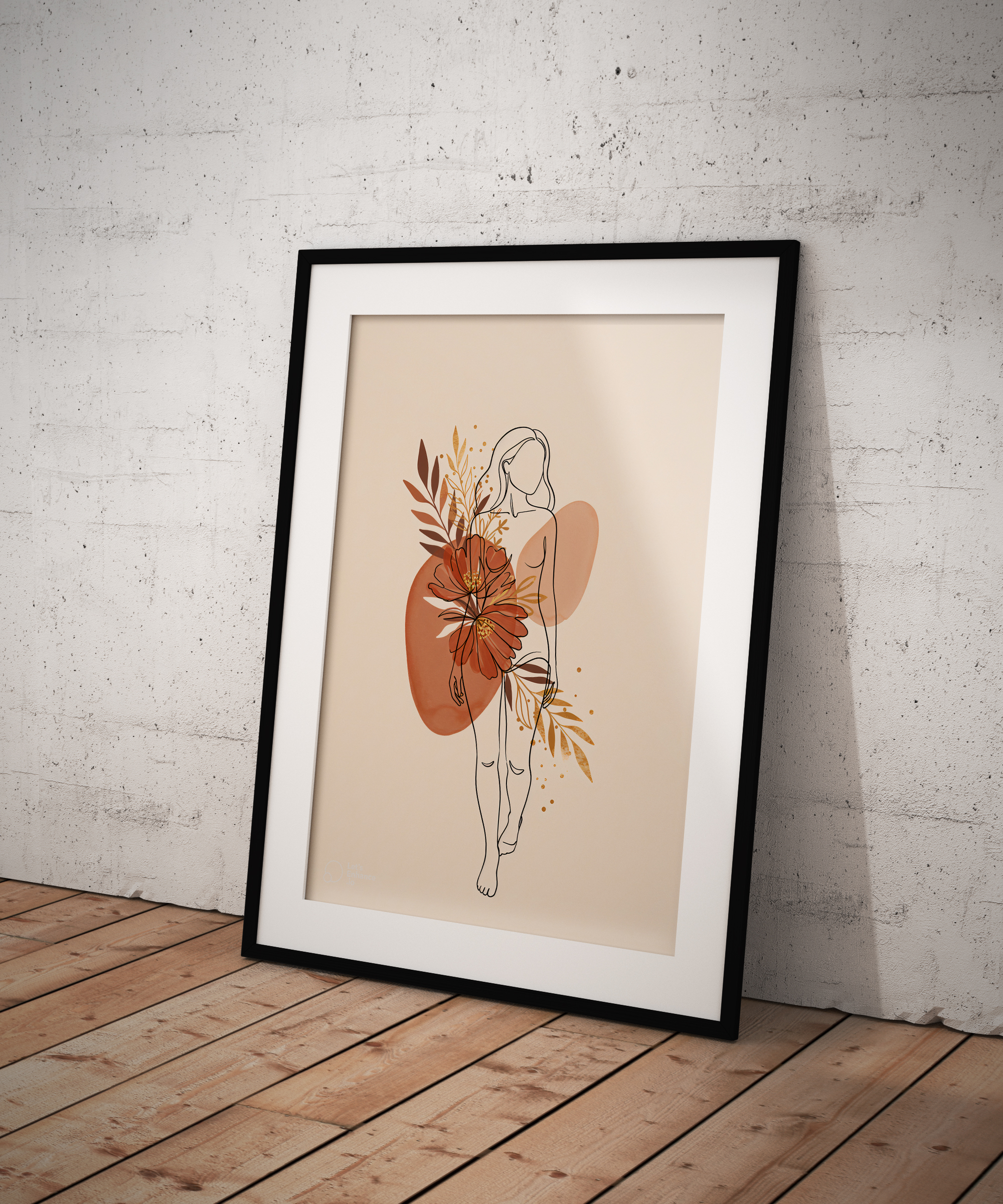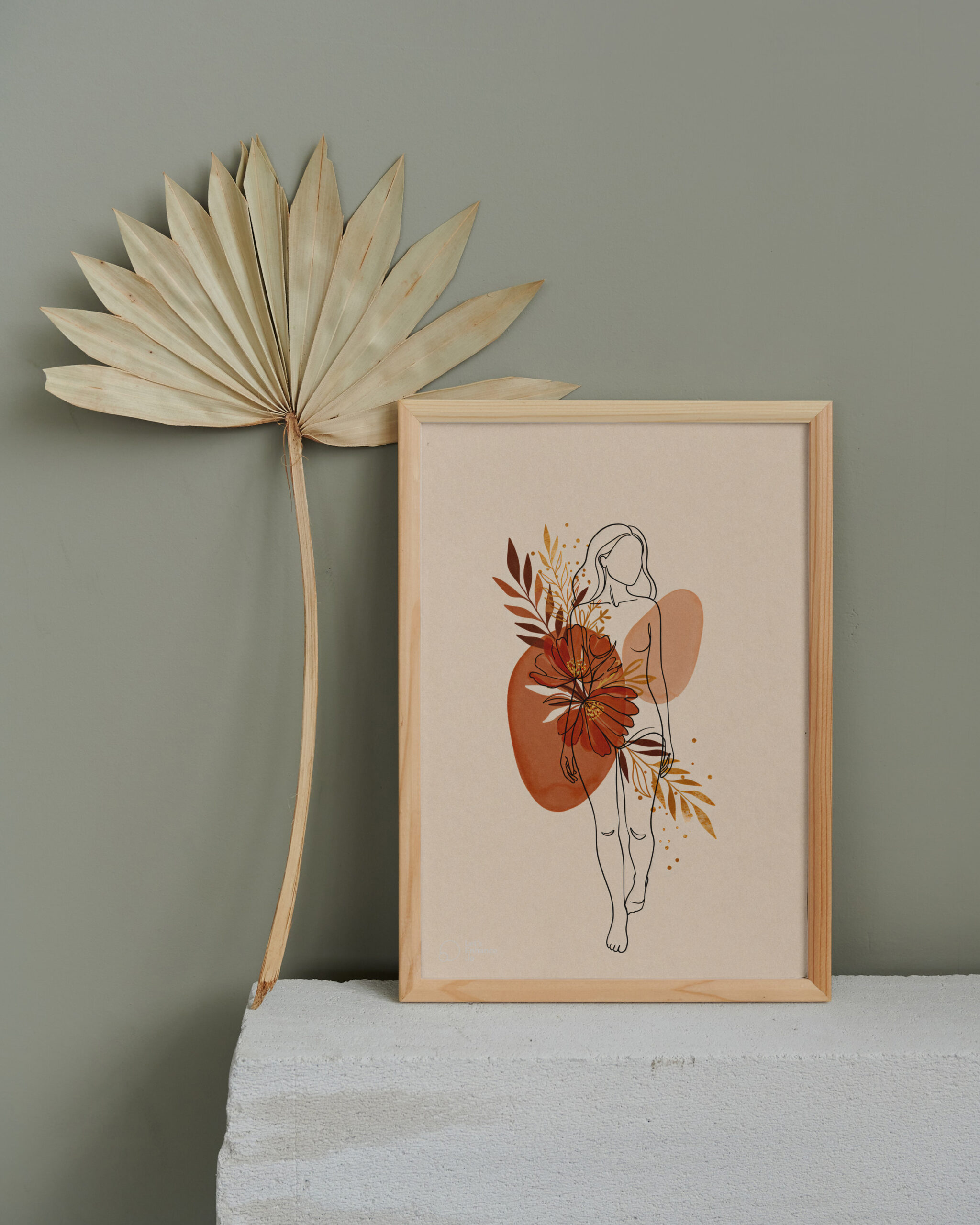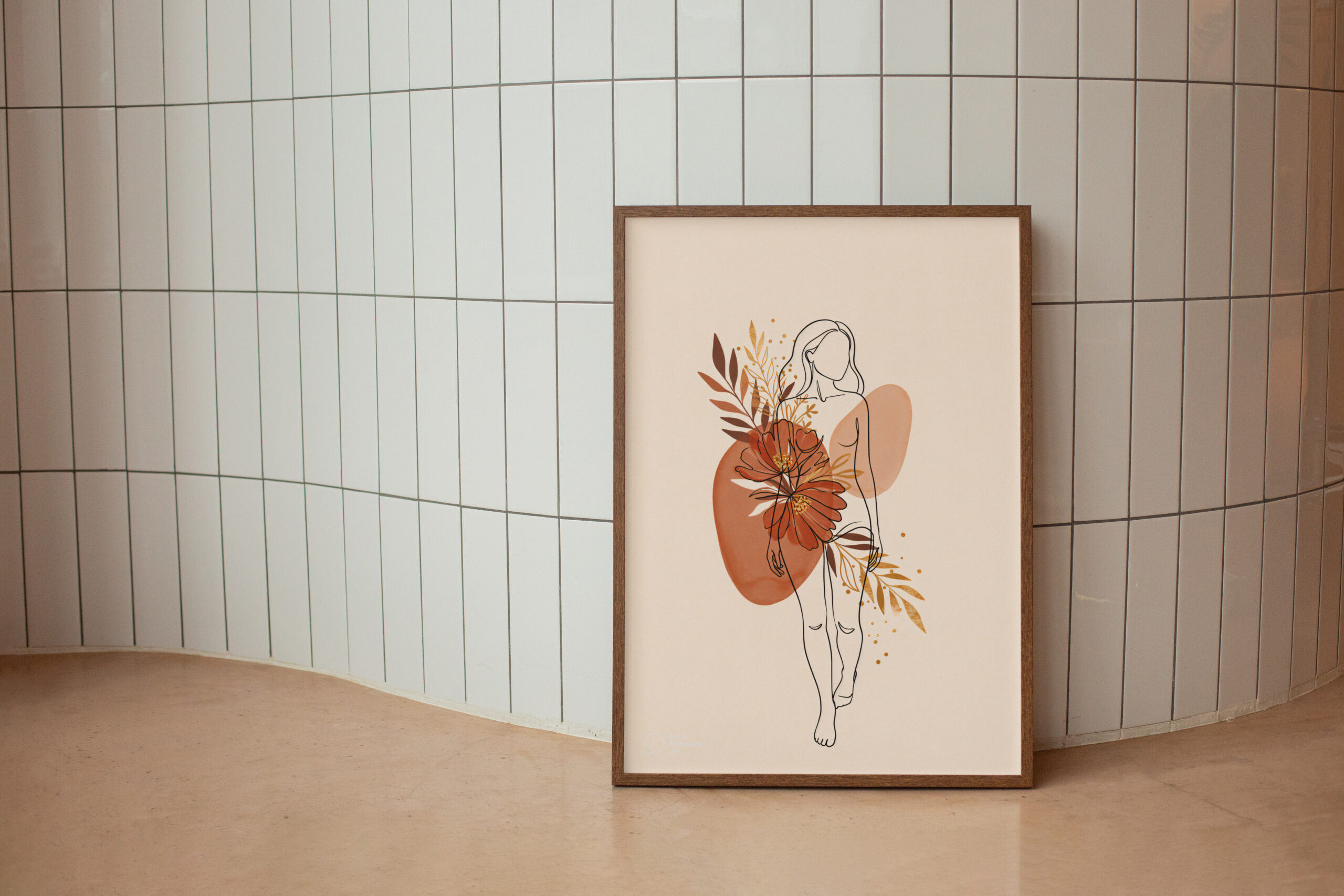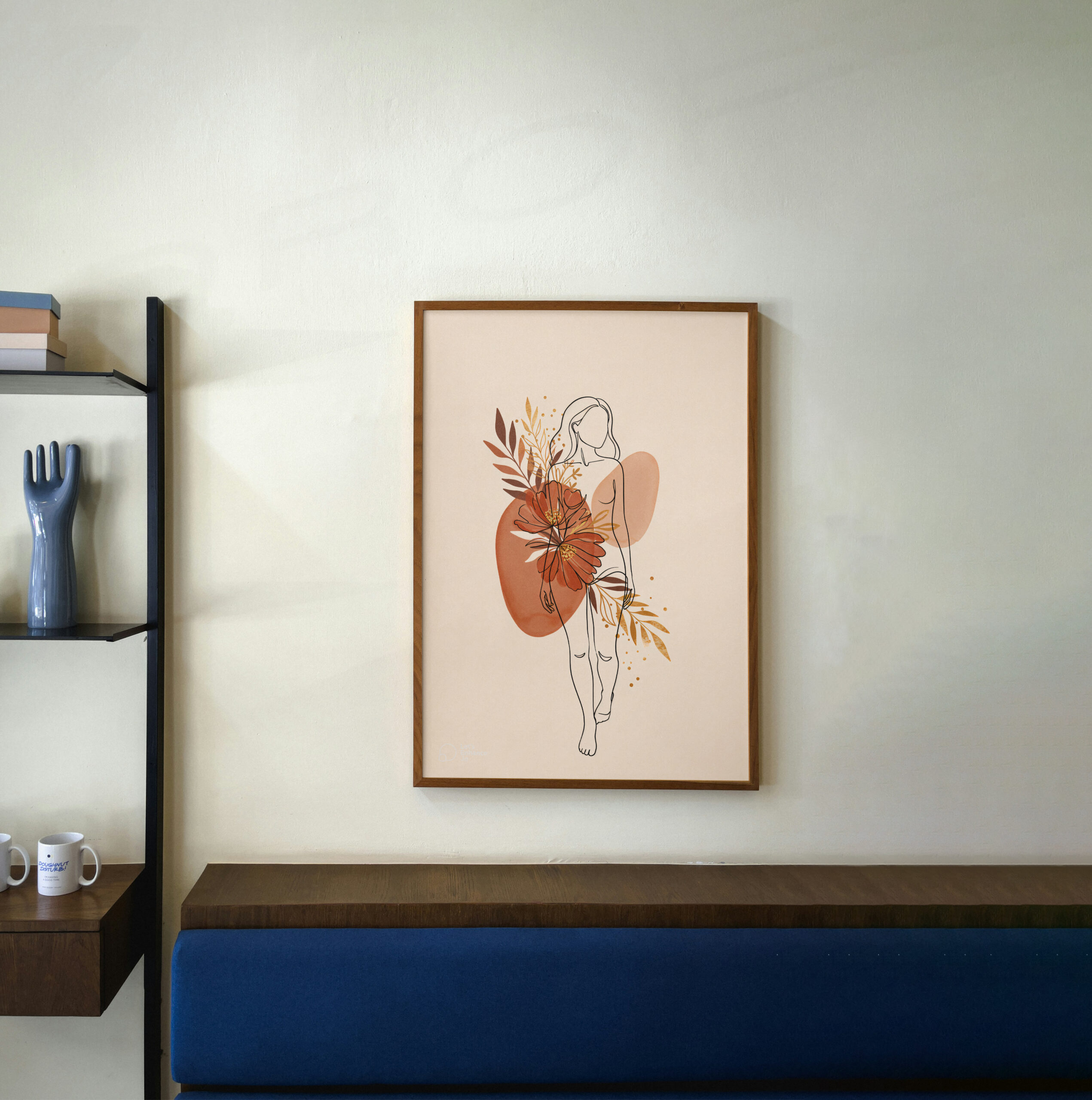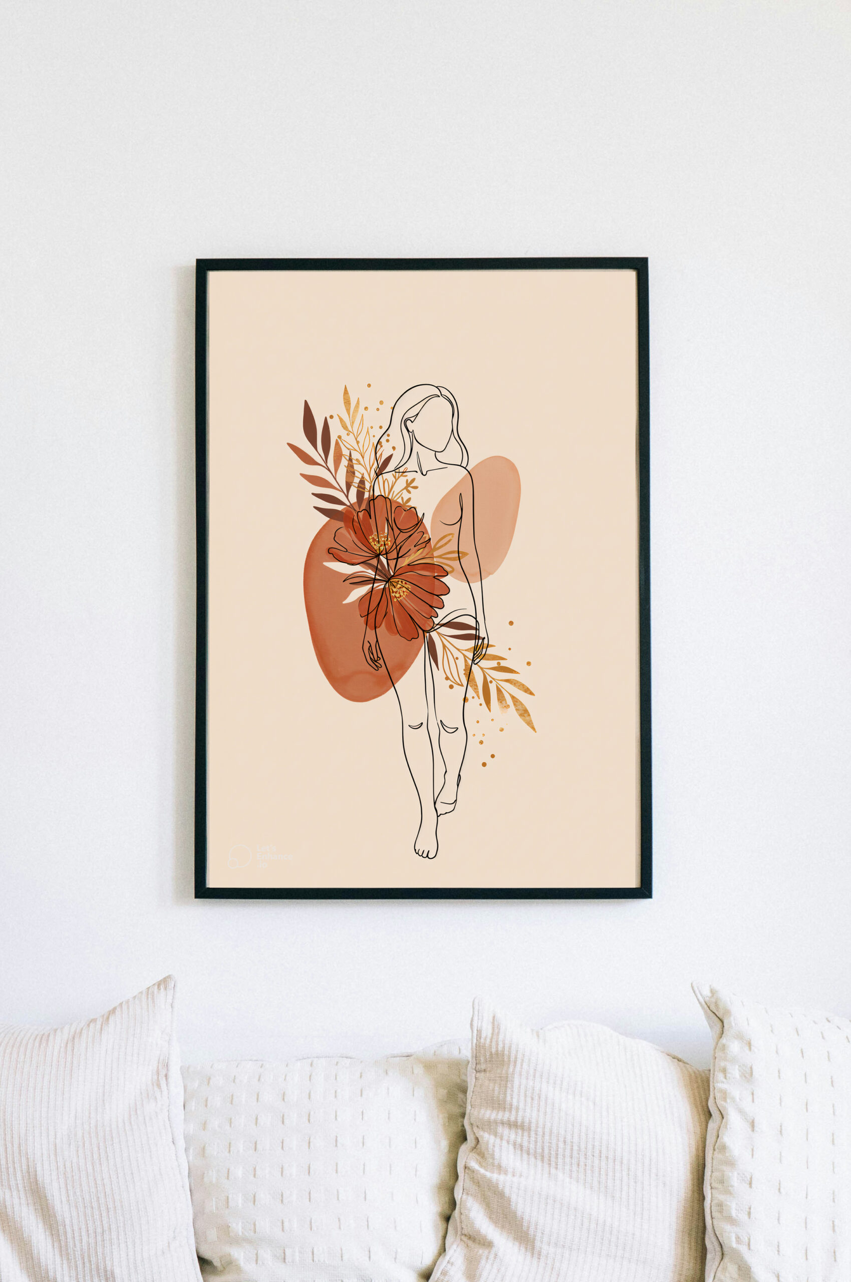 This minimalist floral woman line art print blends a delicate female outline with warm botanical elements and abstract earth-toned shapes. The figure feels light, balanced, and organic, as if nature and body are sharing the same rhythm.