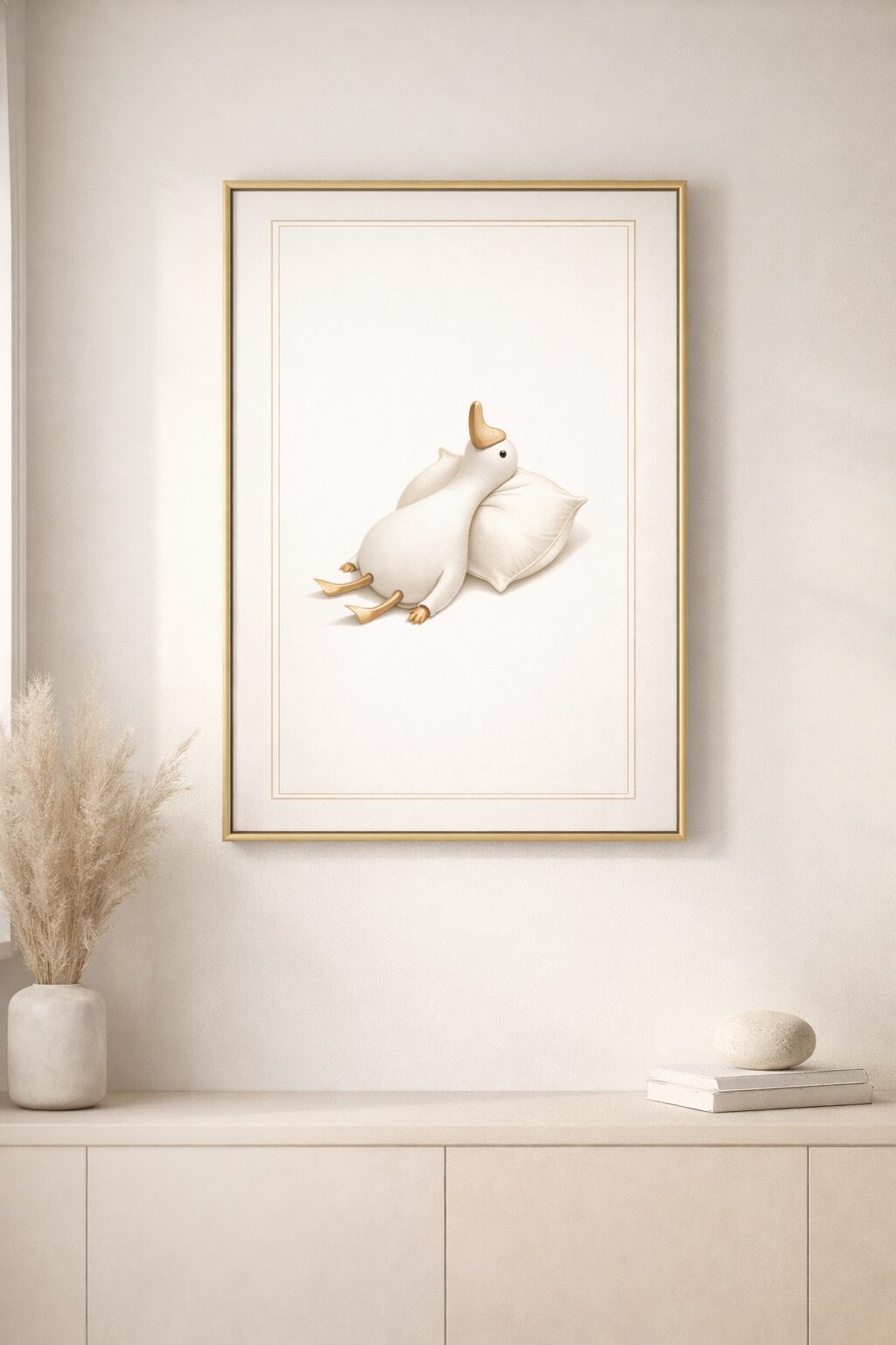 Quiet charm, intentional simplicity. This minimalist goose wall art print features a softly rounded white goose resting against a cushion, illustrated with smooth contours, neutral ivory tones, and subtle gold accents. The composition is calm, balanced, and quietly playful. It brings warmth without clutter and personality without noise.