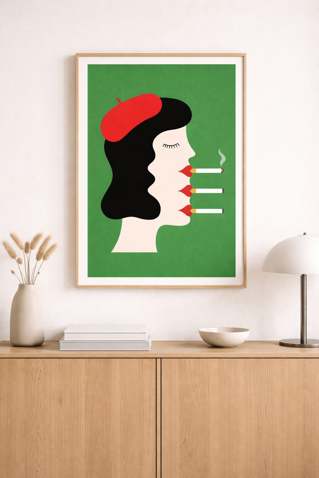 Style with consequences. This modern wall art print features a minimalist female profile wearing a red beret, eyes closed, lips aligned with three cigarettes in a striking visual repetition. Flat colors, sharp contrast, and controlled geometry turn a controversial subject into a clean, conceptual statement.