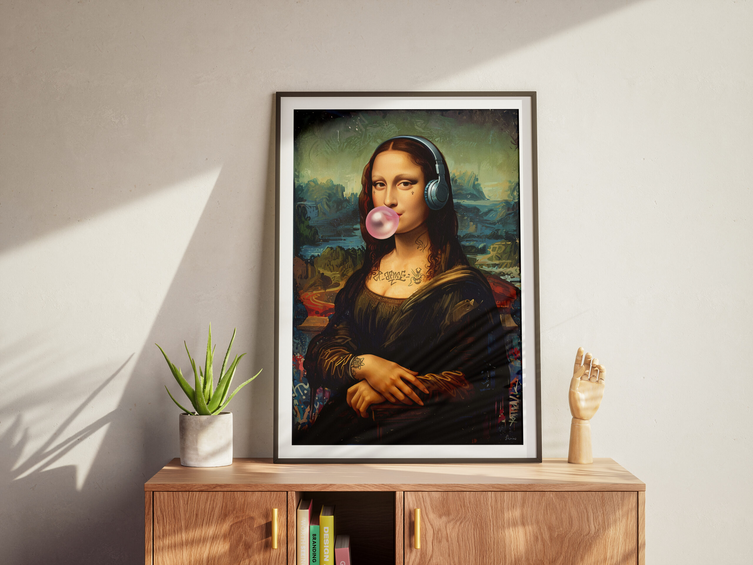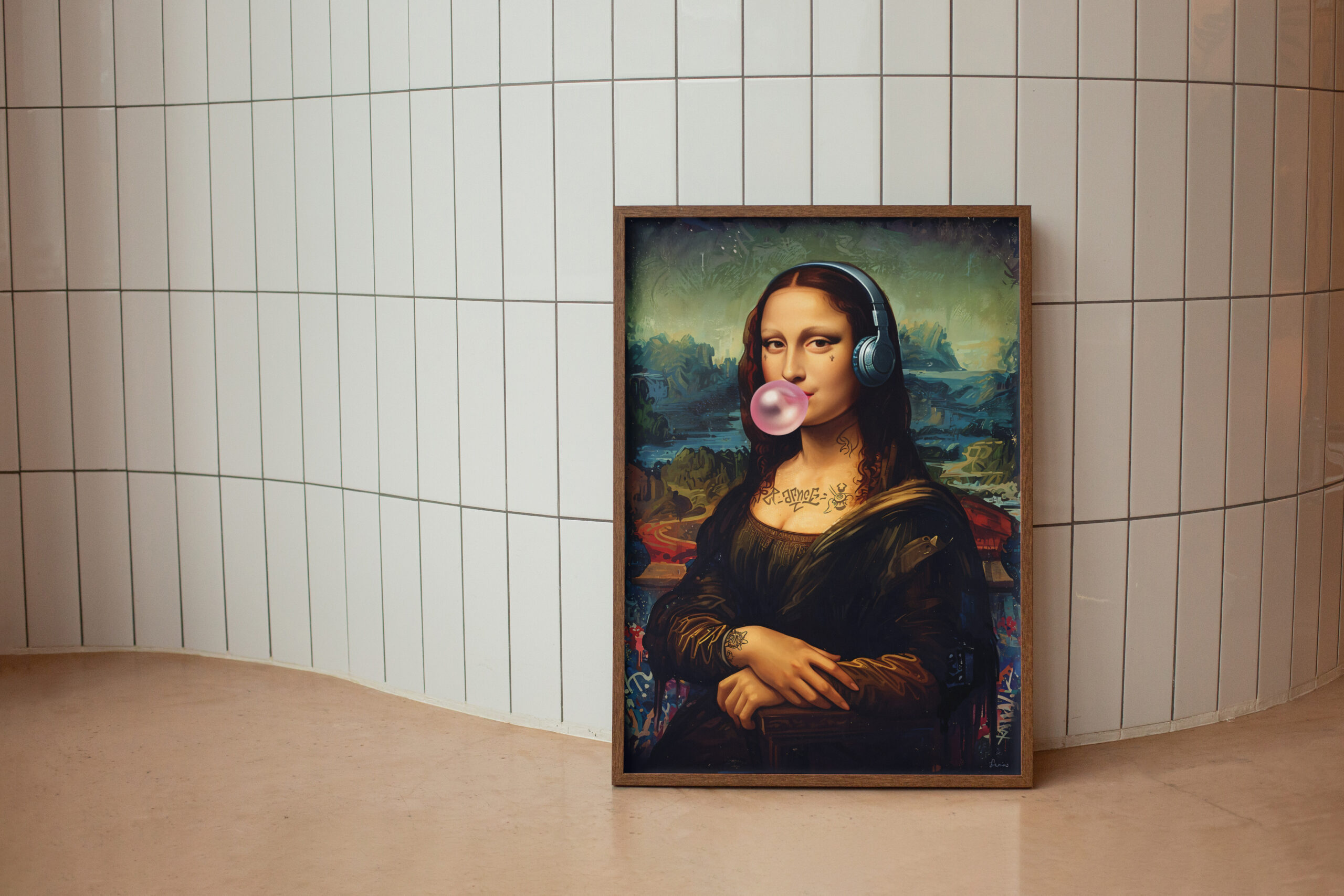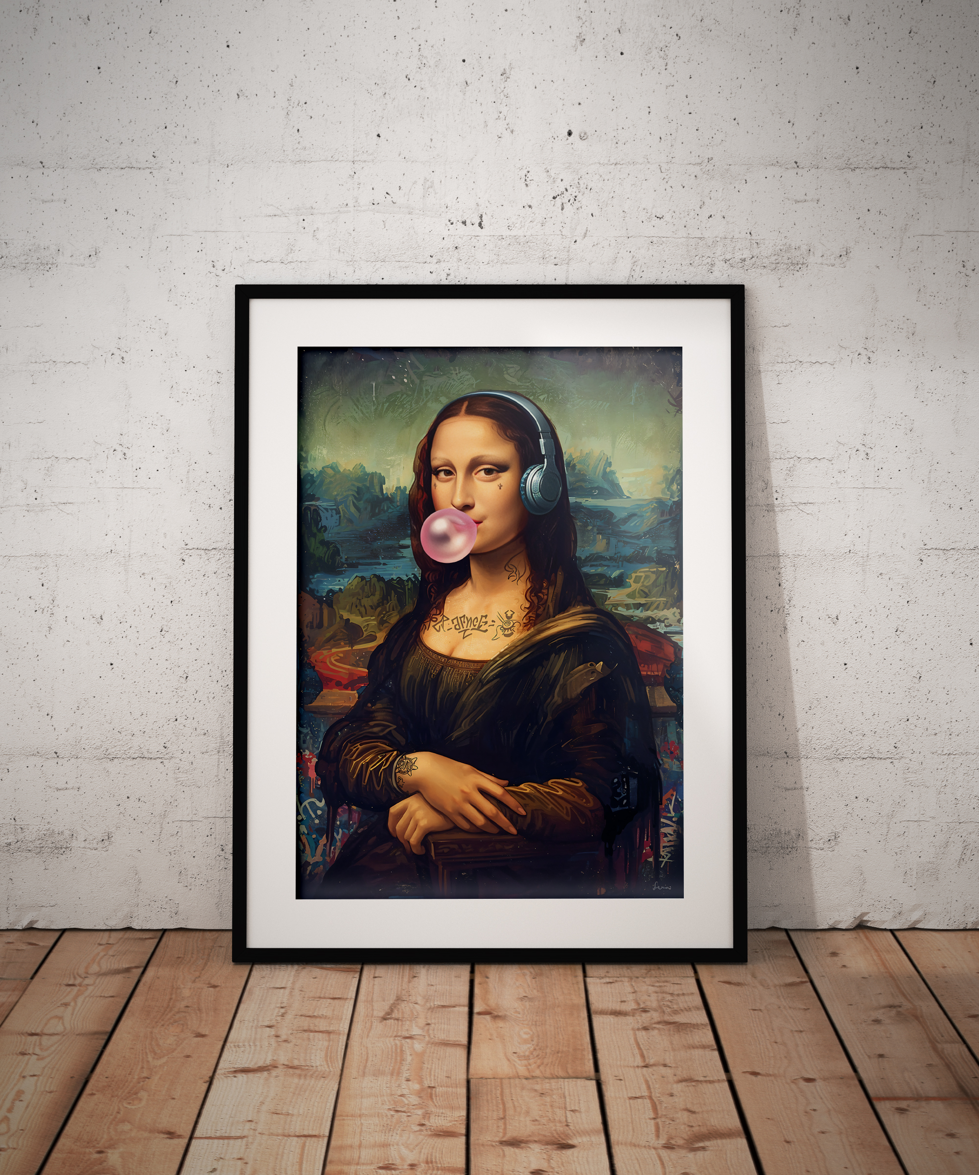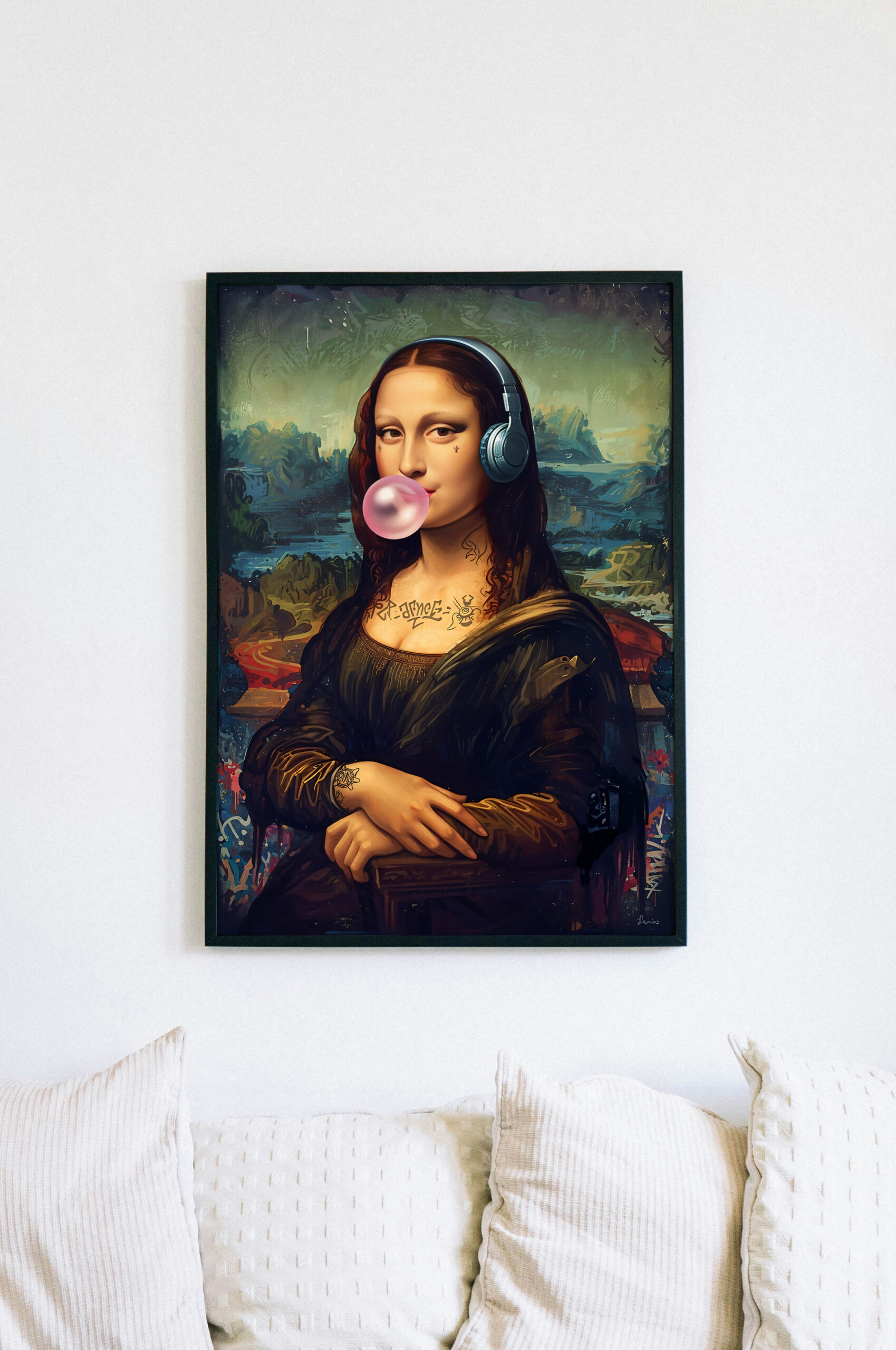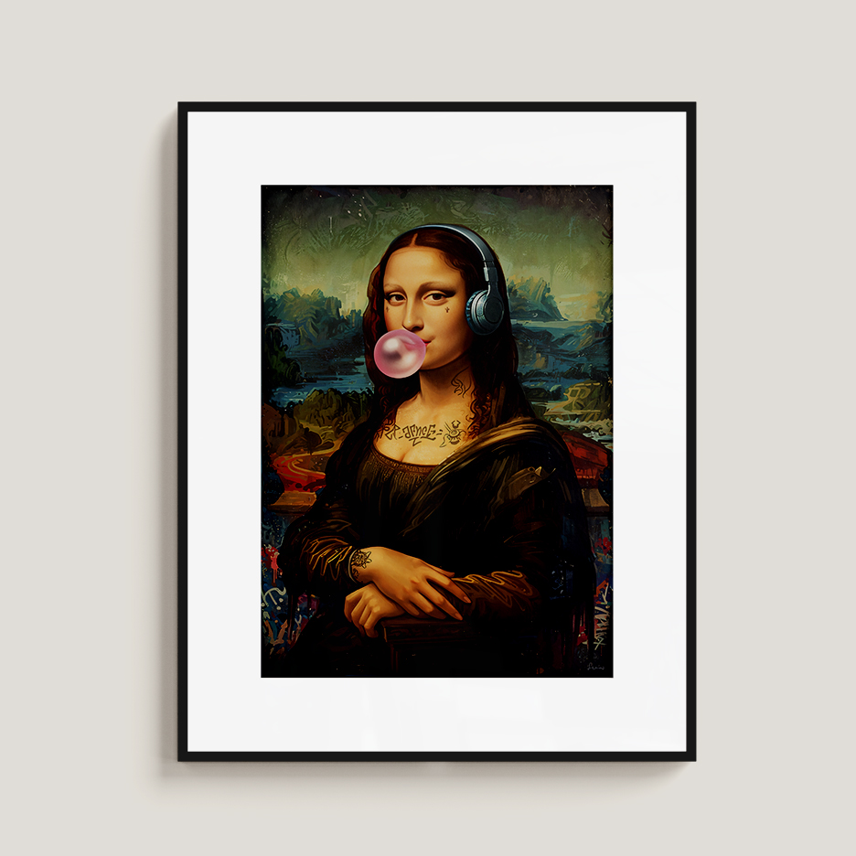 Give your space a bold urban twist with this modern graffiti-style Mona Lisa artwork. Featuring the iconic portrait reimagined with headphones, tattoos, a bubblegum pop, and vibrant street art details, this digital art print blends Renaissance charm with edgy pop culture. Ideal for contemporary, eclectic, or street-style interiors. Available as a high-resolution instant download for easy, stylish wall decor.