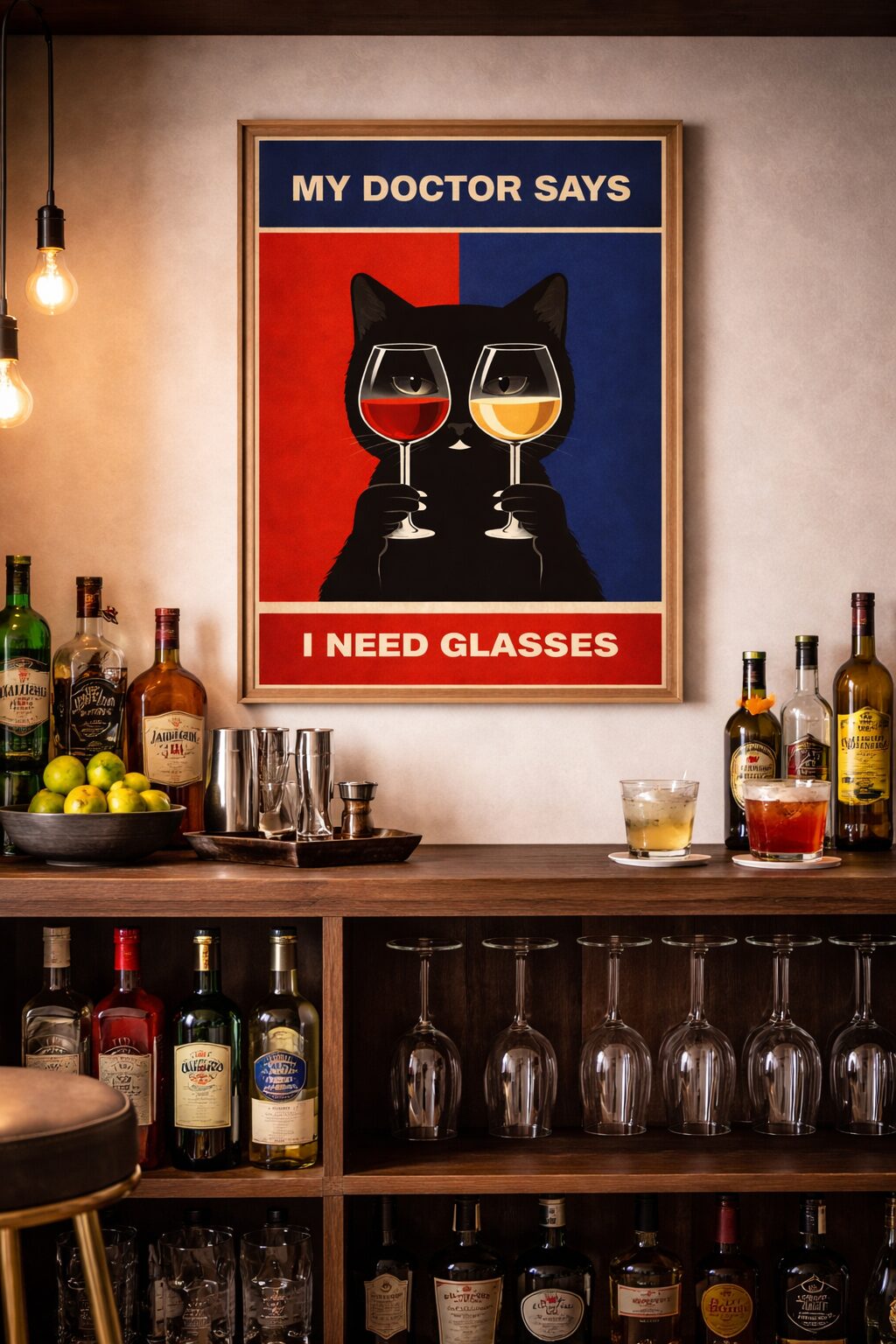 Medical advice, creatively interpreted. This vintage-style cat wall art features a calm, deadpan black cat holding two wine glasses, perfectly centered against a bold red-and-blue background. The headline reads “My Doctor Says” while the punchline lands quietly at the bottom: “I Need Glasses.” Literal, visual, and unapologetically smug.