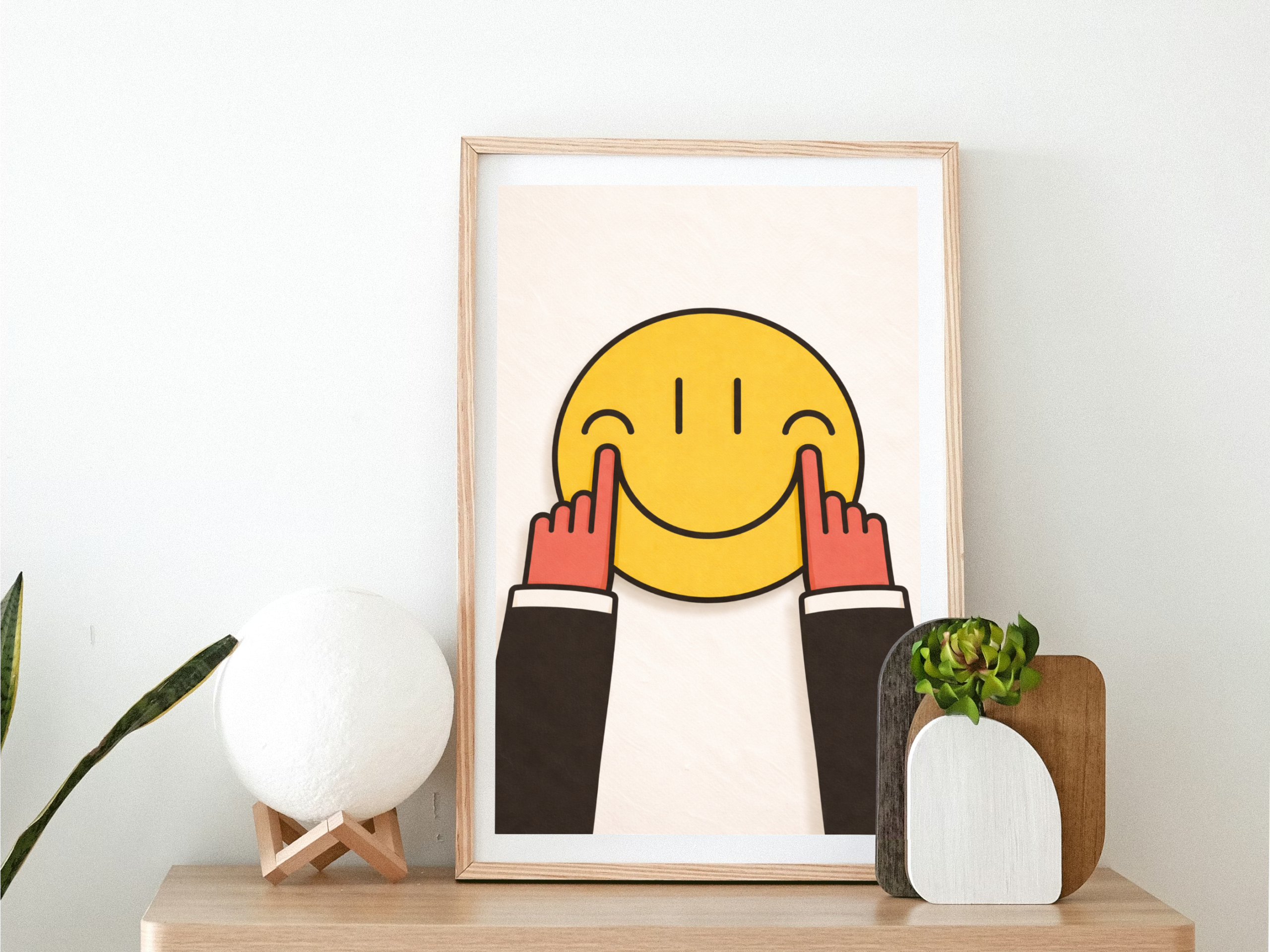 This minimalist dark humor wall art print takes a universally friendly symbol and flips it into a perfectly calm act of defiance. A bold yellow smiley holds up both middle fingers, delivering instant irony with zero clutter.