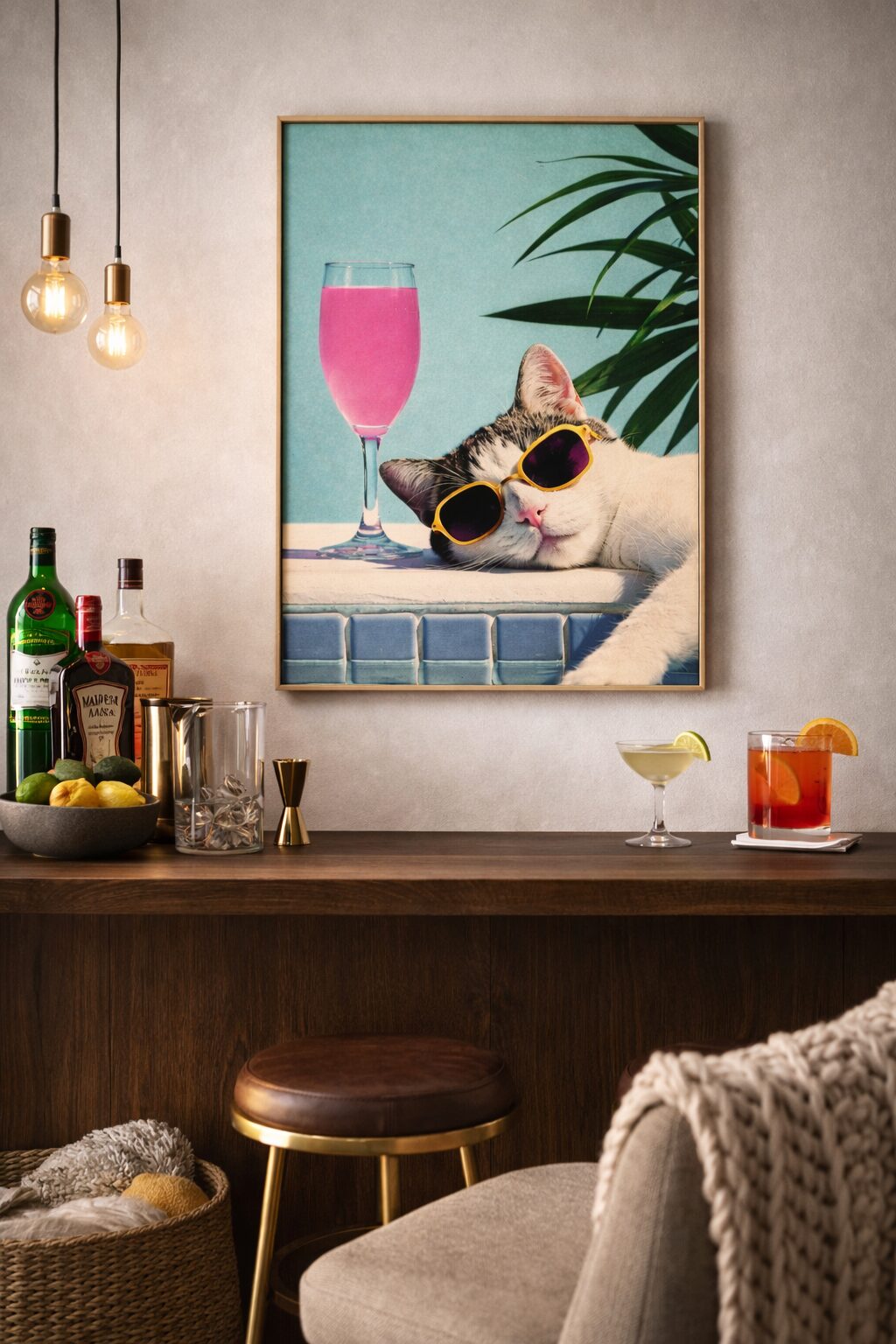 Maximum relaxation. Zero urgency. This summer-inspired cat wall art captures a laid-back black-and-white cat stretched beside a swimming pool, wearing sunglasses and fully committed to doing absolutely nothing. A pink cocktail sits nearby, the water reflects soft light, and the entire scene radiates slow, sun-soaked calm.