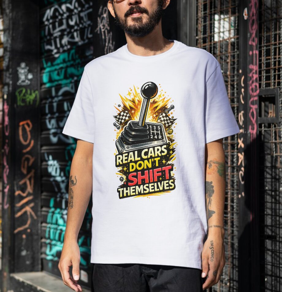 Wear the energy of Real Cars Don’t Shift Themselves Manual Gear as a clean, bold graphic on a comfortable cotton t-shirt made for daily life.