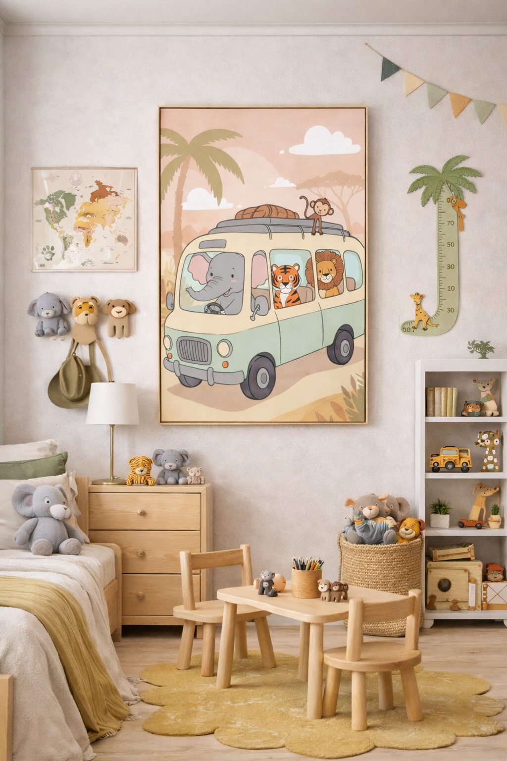 This charming safari bus illustration features a joyful crew of jungle animals traveling together through a warm, sunlit landscape. An elephant behind the wheel, joined by a lion, tiger, and playful monkey, creates a scene full of imagination, teamwork, and gentle fun.