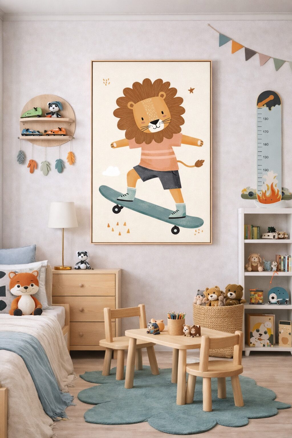 This playful wall art features a cheerful lion skateboarding, designed to bring movement, confidence, and joy into a child’s space. The illustration combines soft textures with a sense of motion, making it engaging without feeling loud or chaotic.