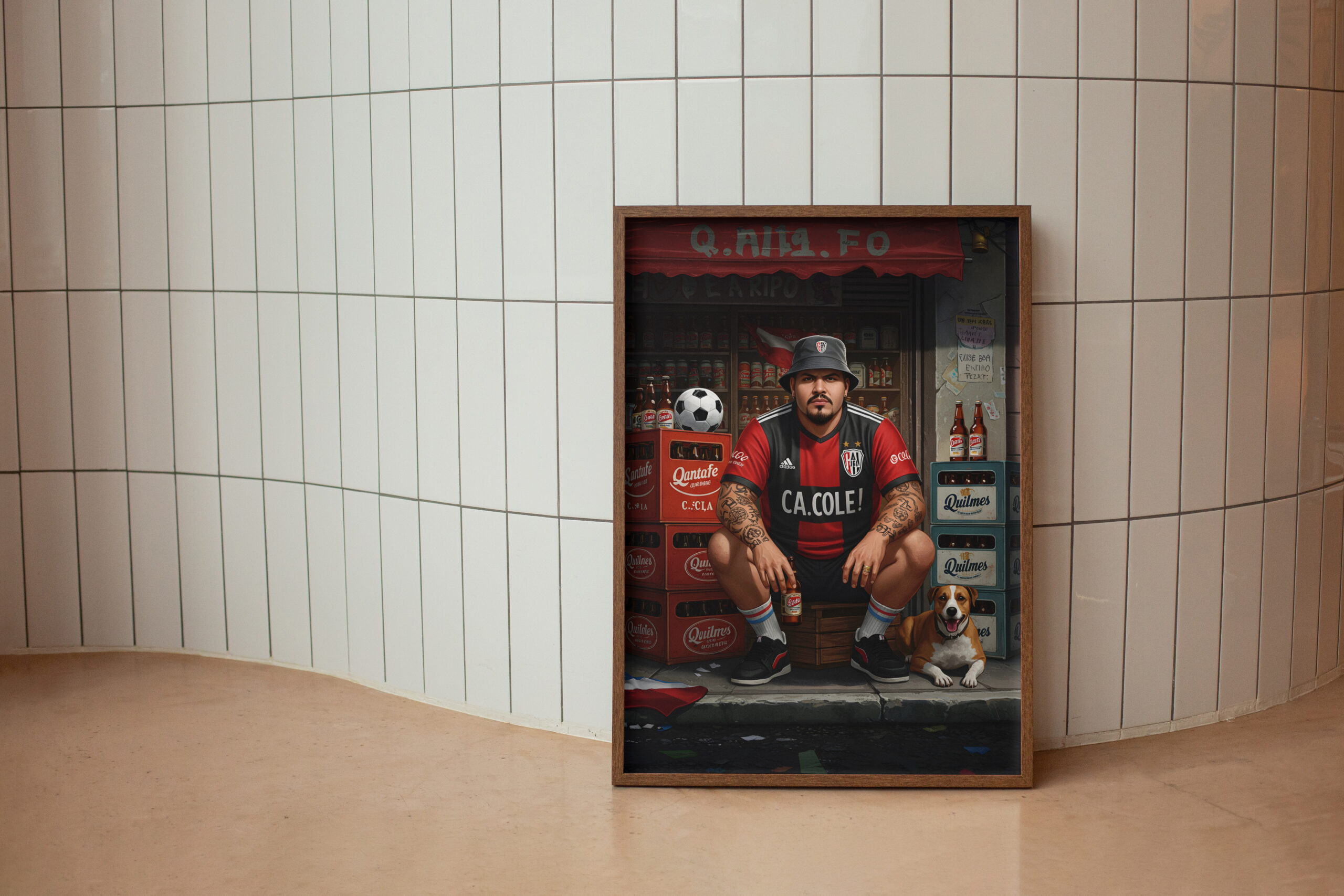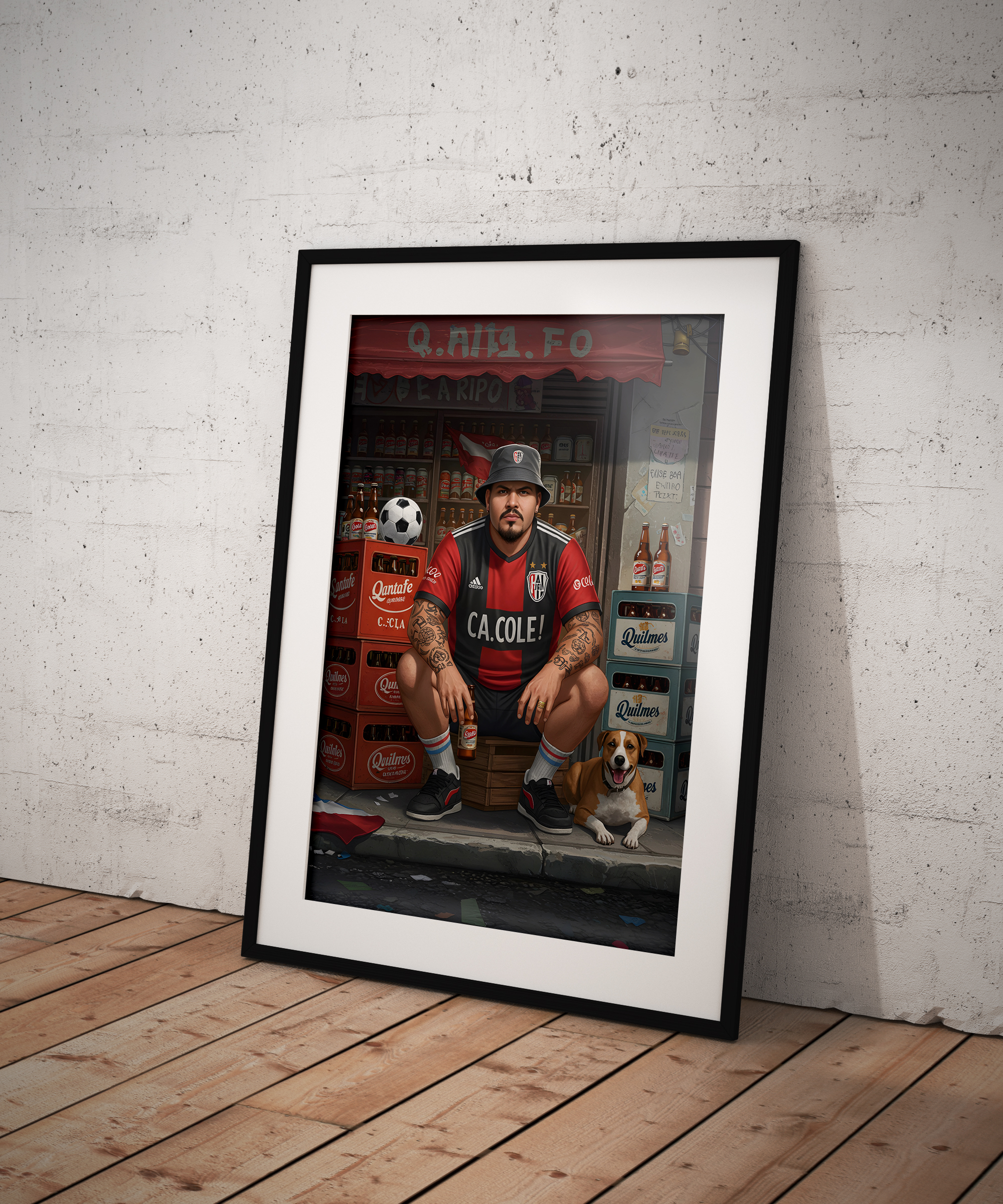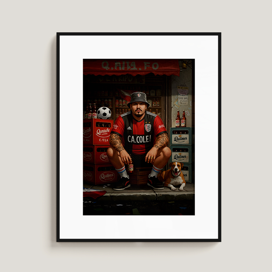 This Street Football wall art print captures raw urban energy: a grounded football fan posted in front of a neighborhood shop, surrounded by beer crates, worn signage, and everyday chaos. Tattoos, posture, expression. No performance. Just presence.