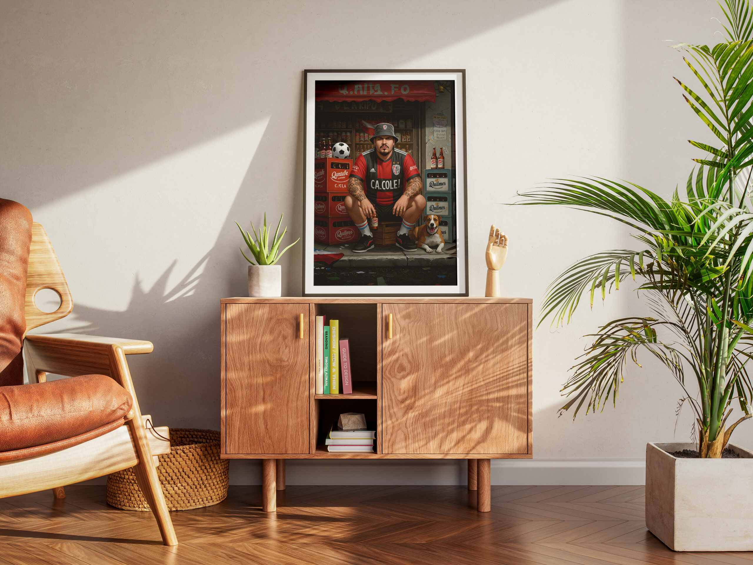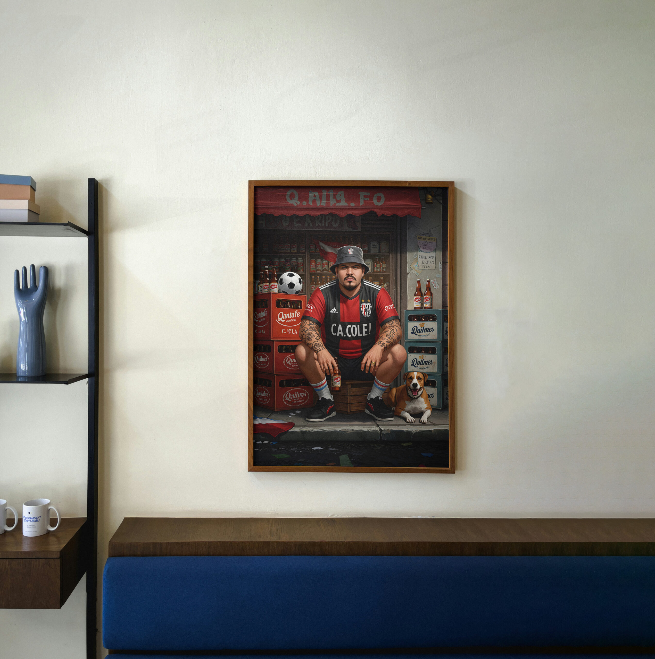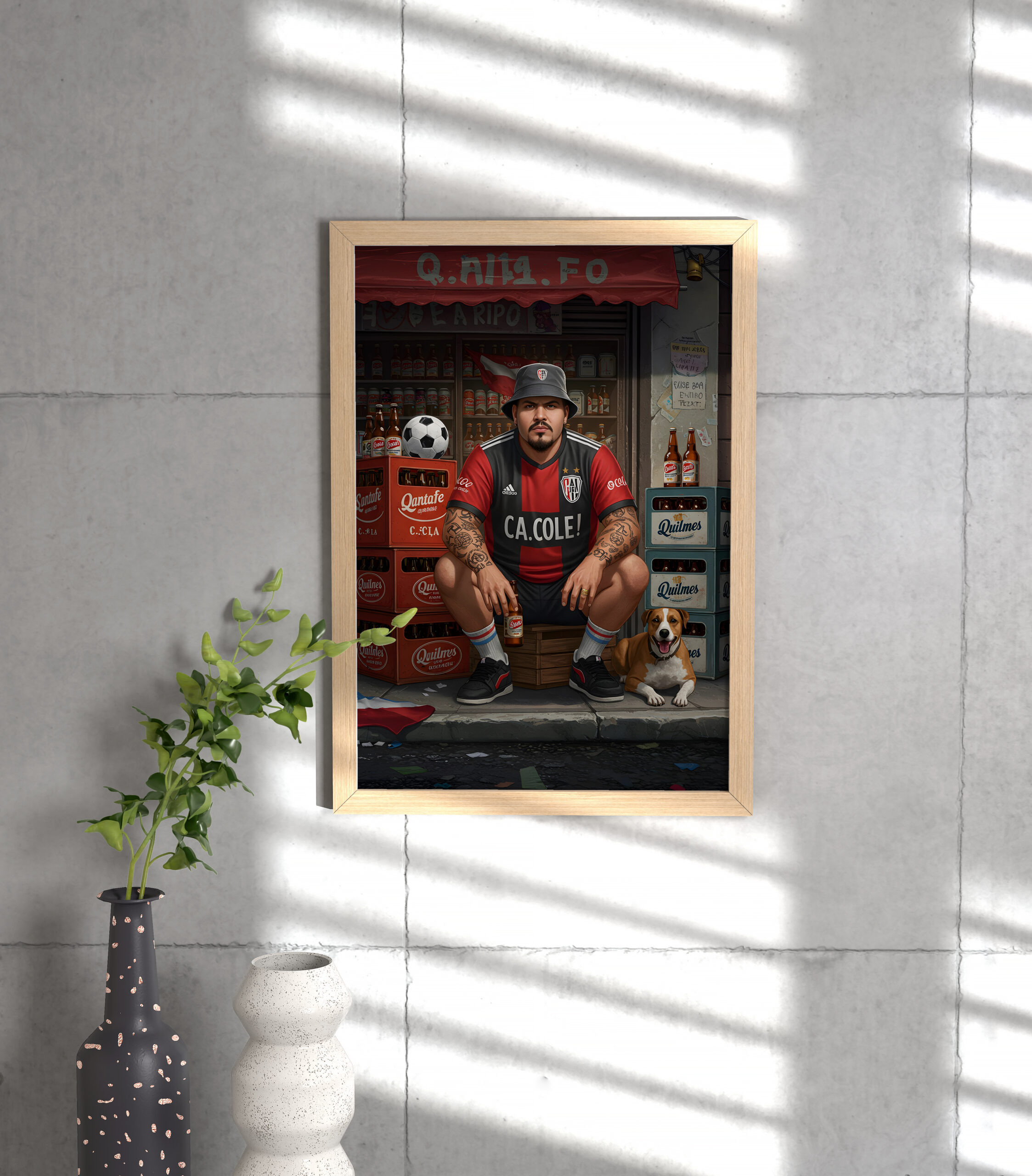 This Street Football wall art print captures raw urban energy: a grounded football fan posted in front of a neighborhood shop, surrounded by beer crates, worn signage, and everyday chaos. Tattoos, posture, expression. No performance. Just presence.
