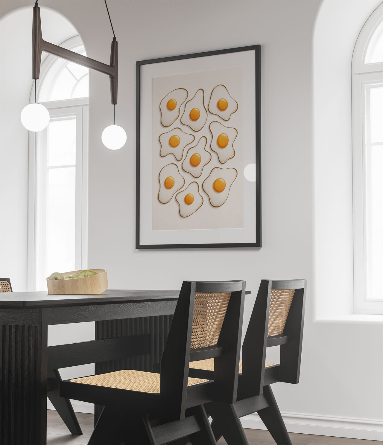 This minimalist egg wall art print turns sunny-side shapes into a warm, modern pattern. Soft neutrals and bright yolks create a cheerful rhythm that feels clean, contemporary, and easy to style.