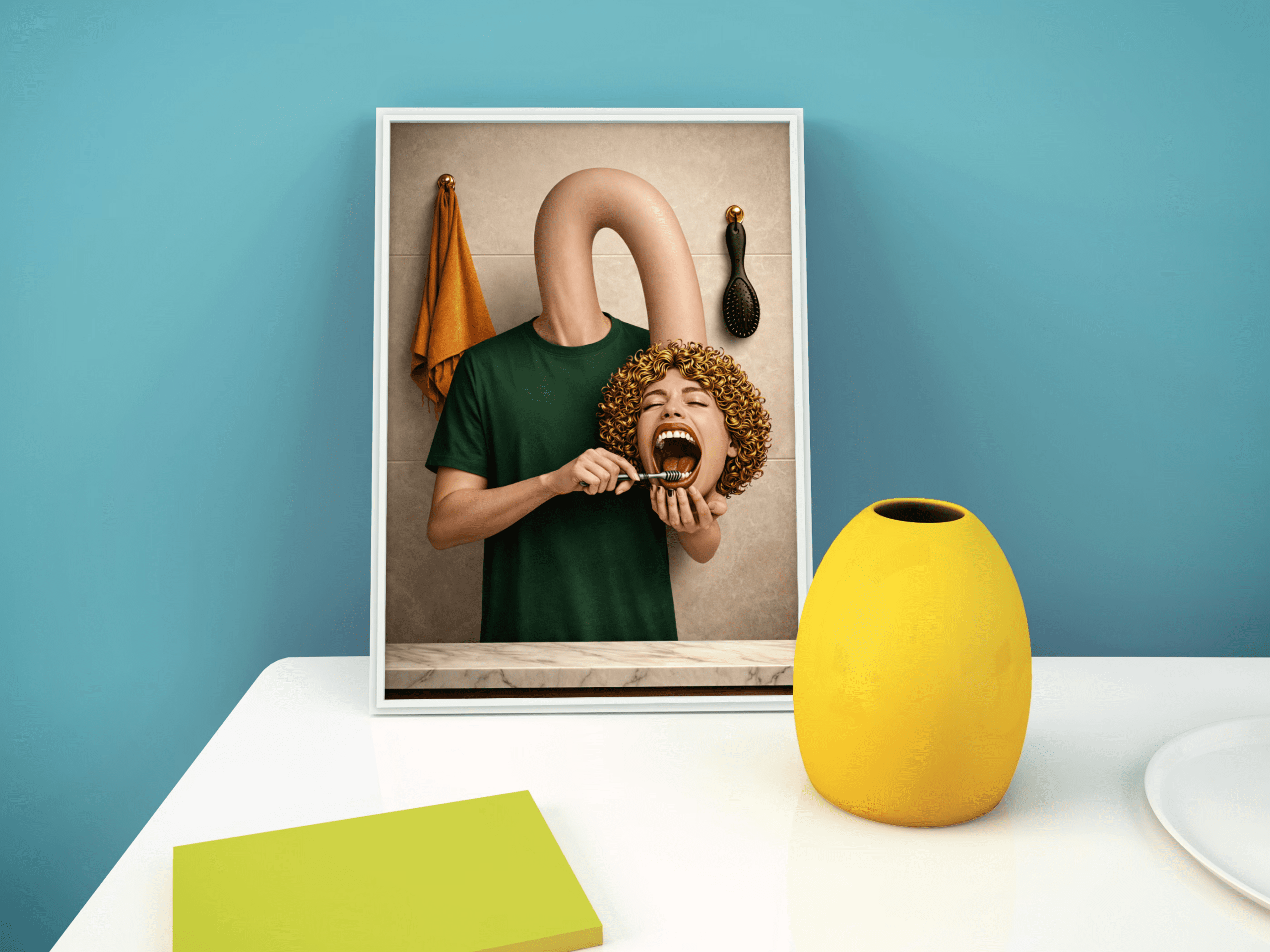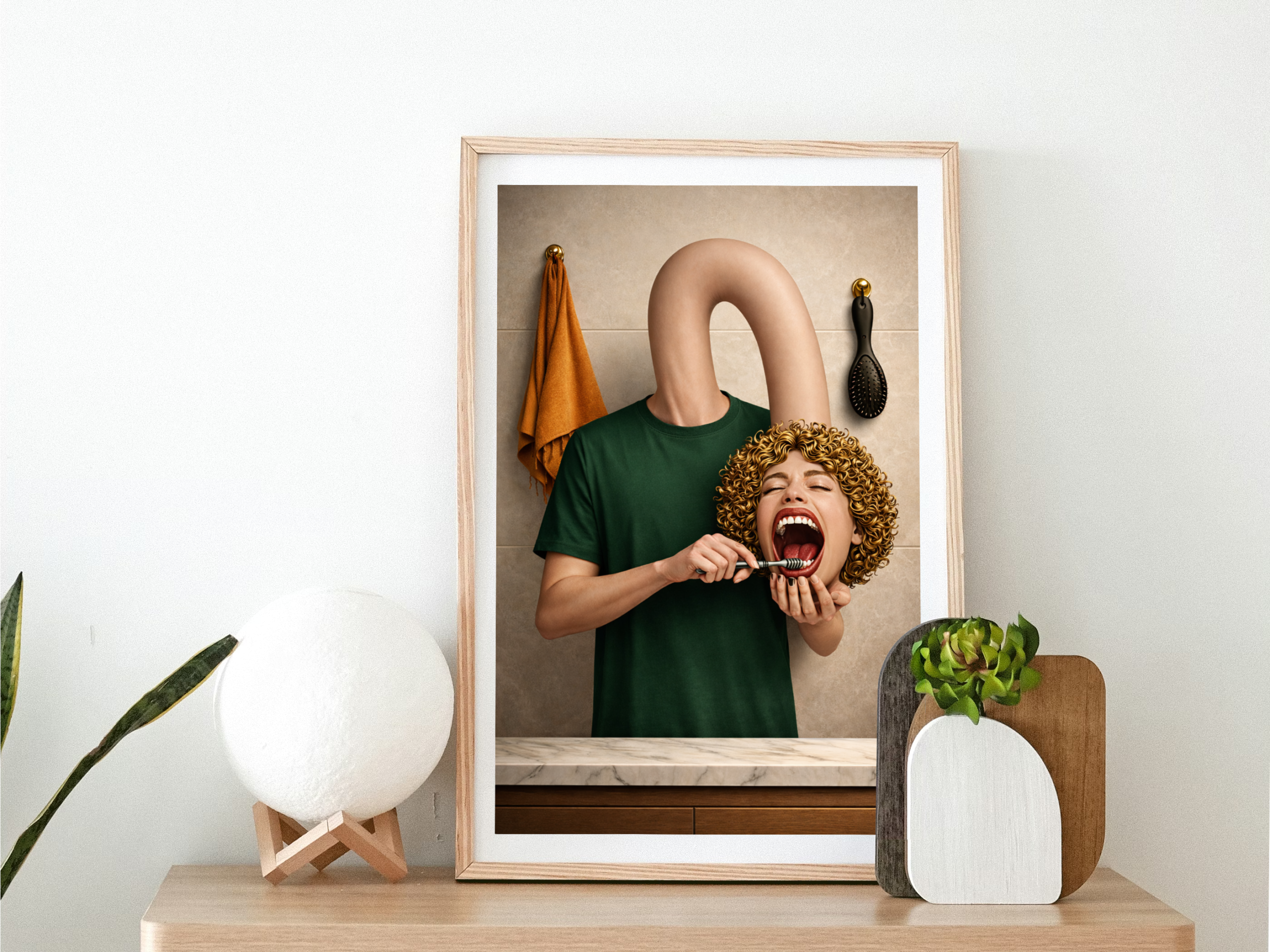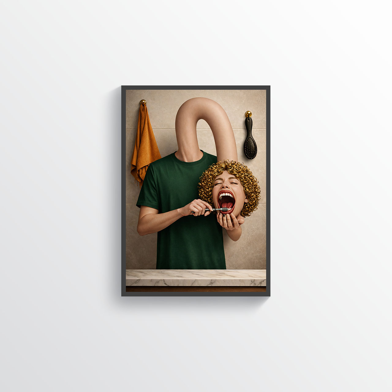 This surreal bathroom wall art print turns a familiar routine into a sharply composed visual joke: an impossible neck, a detached head, and a moment that feels both cinematic and unsettling in the best way. It’s weird on purpose. It’s controlled chaos. And it looks disturbingly high-end while doing it.