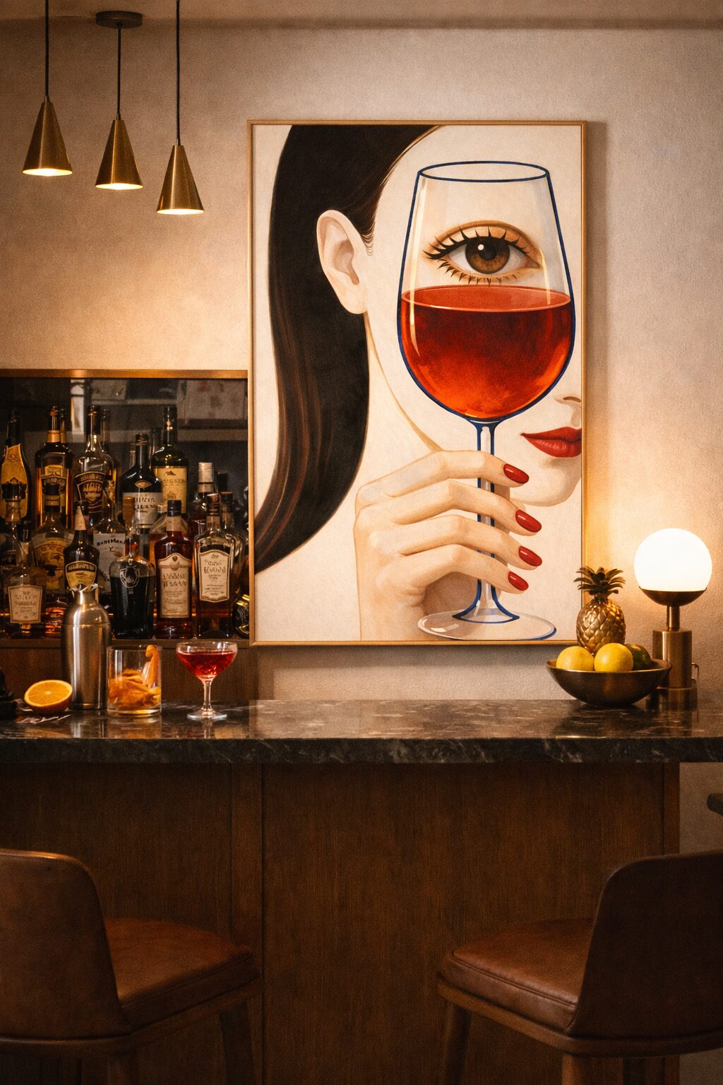 The composition is deliberate. The glass becomes a lens. The wine becomes atmosphere. Soft painterly textures, warm skin tones, and bold red accents create a piece that feels timeless yet unmistakably modern. It doesn’t shout luxury. It assumes it.