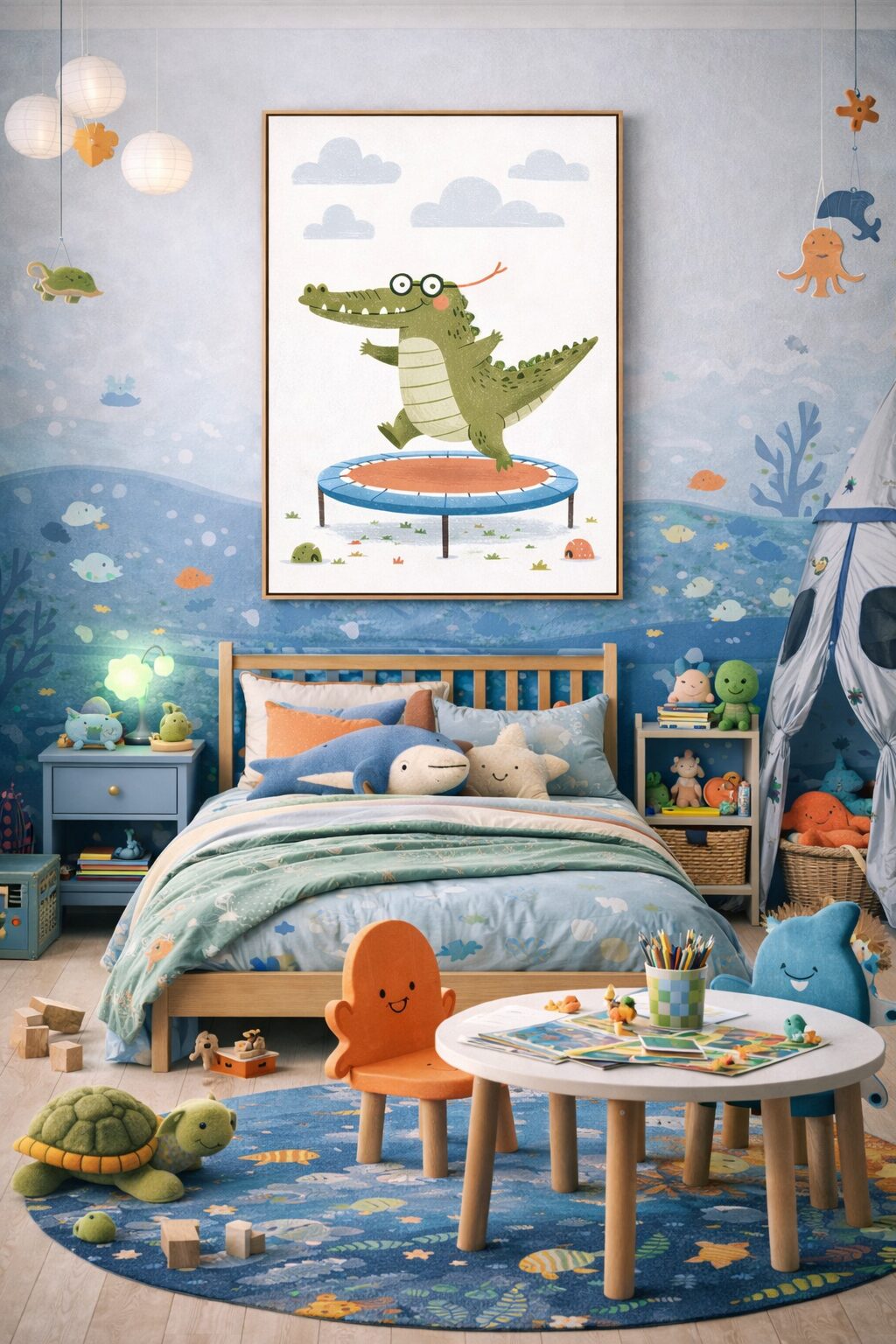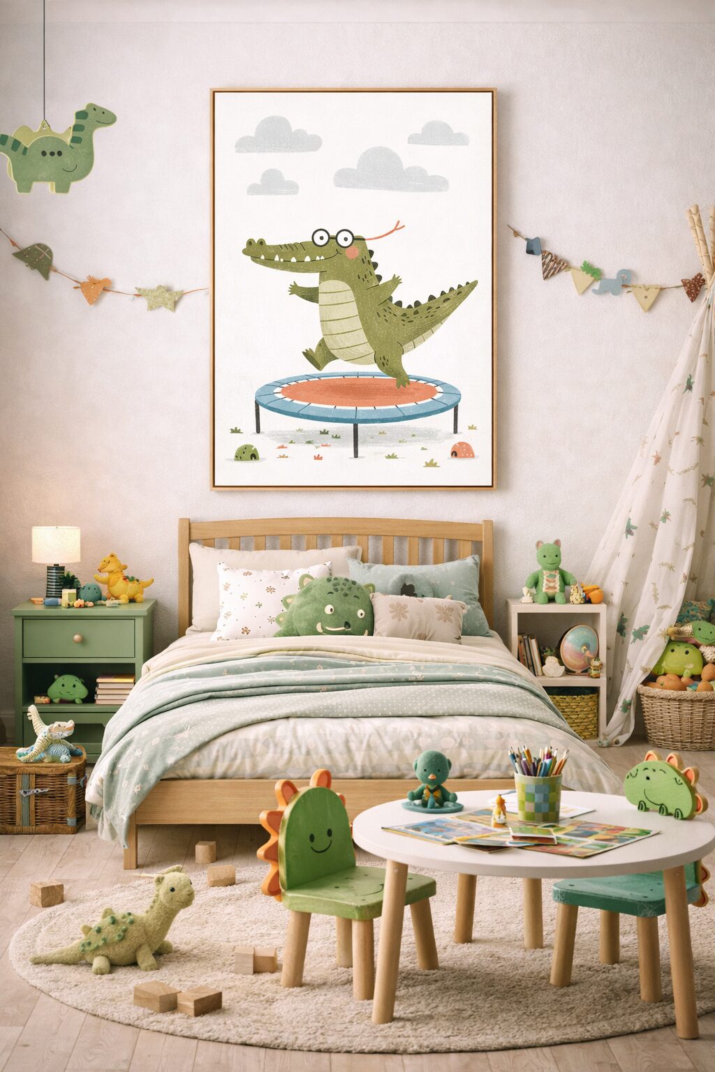 This whimsical crocodile illustration captures pure, unfiltered fun. A cheerful croc mid-jump on a trampoline, glasses on, tail in motion, floating under soft clouds. It’s energetic without chaos, playful without clutter.