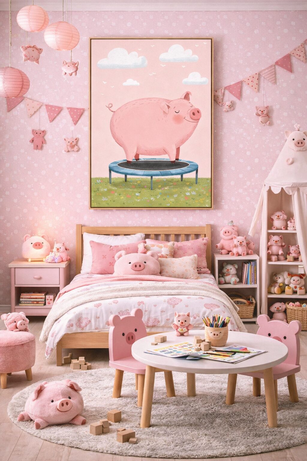 This whimsical pig illustration captures a moment of peaceful happiness. A gentle pink pig standing calmly on a trampoline beneath a pastel sky, eyes closed, completely at ease. It’s playful without being loud, comforting without trying too hard.