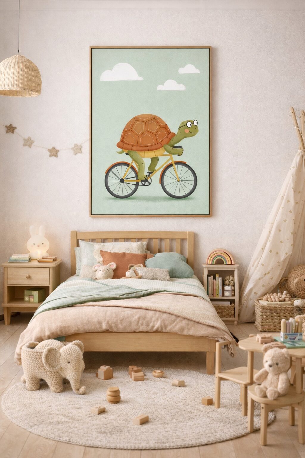 This whimsical turtle-on-a-bicycle illustration is a quiet reminder that progress does not need to be loud. A calm, determined turtle pedaling steadily beneath soft clouds, rendered in soothing greens and warm earthy tones.