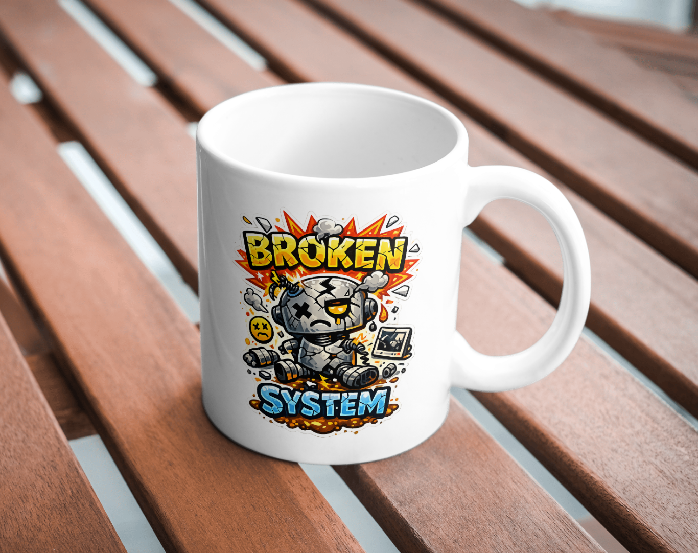 Broken System Mug – Funny Robot Chaos Coffee Cup