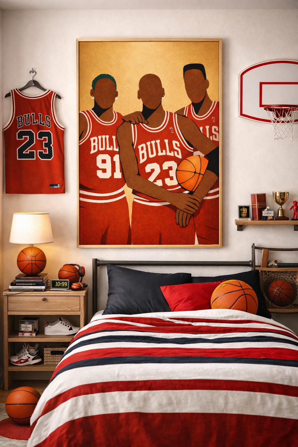 Legacy. Brotherhood. Dominance. This Chicago Bulls dynasty wall art print captures the spirit of one of the most legendary trios in basketball history, inspired by Chicago Bulls and the era defined by Michael Jordan, Scottie Pippen, and Dennis Rodman.