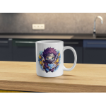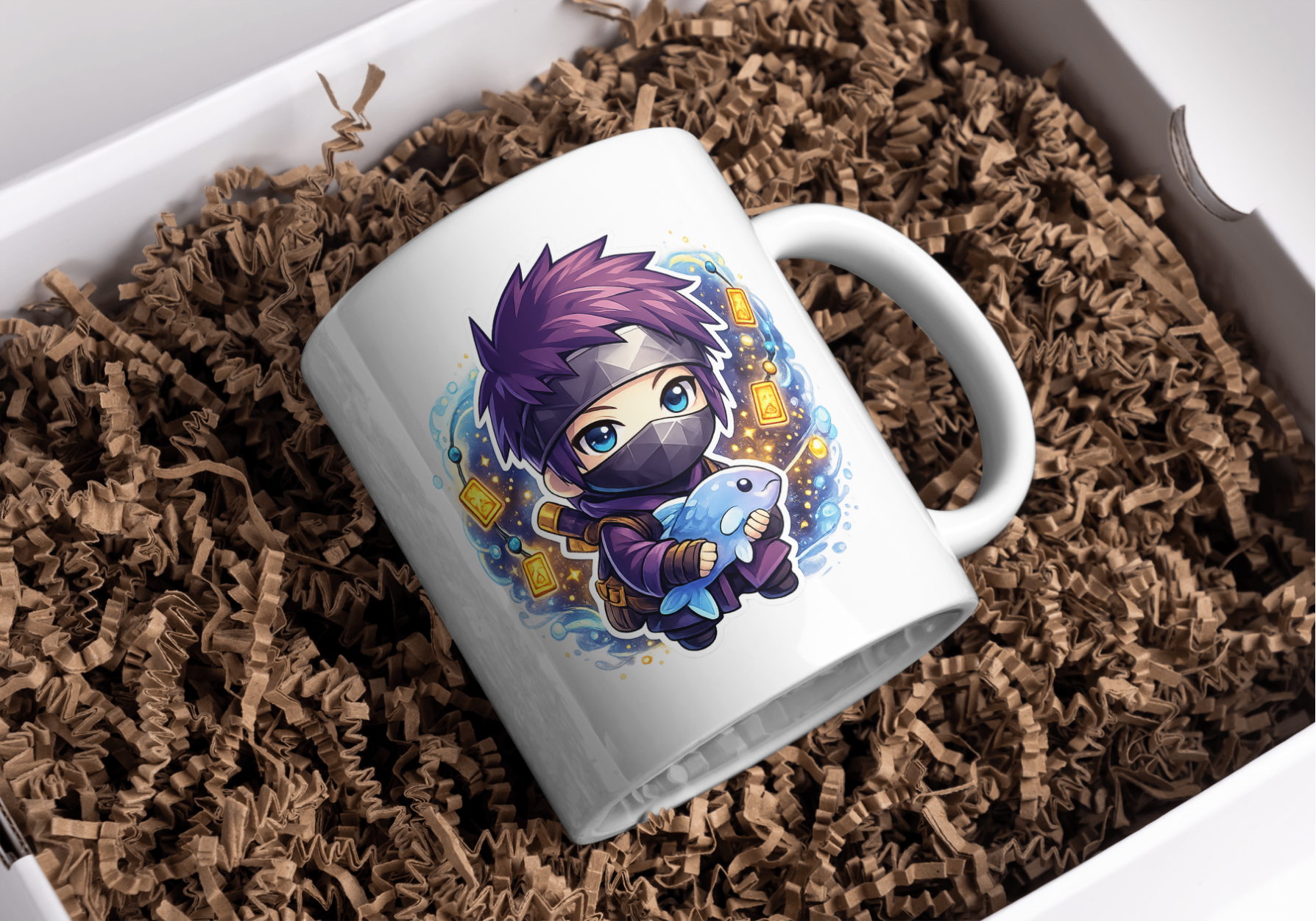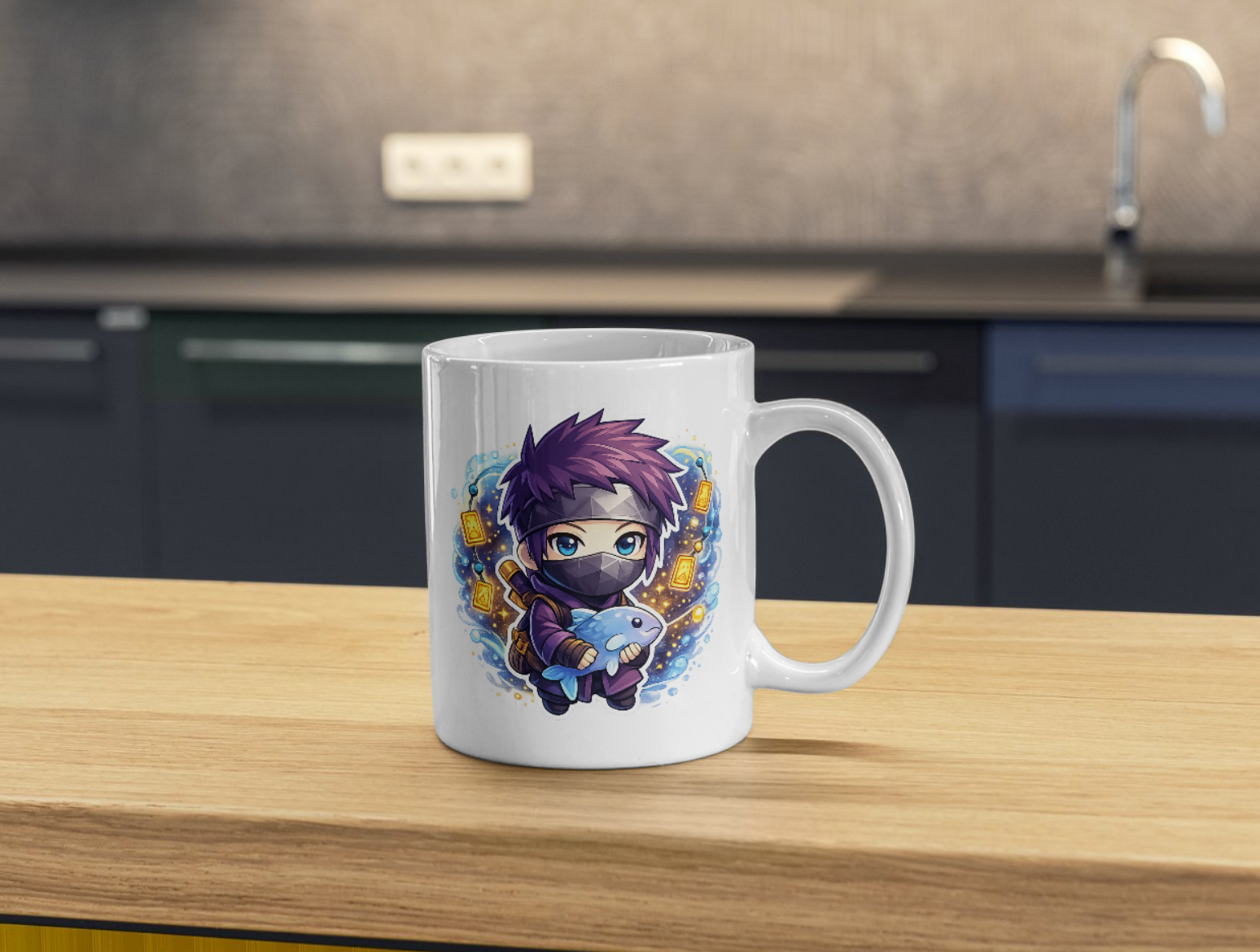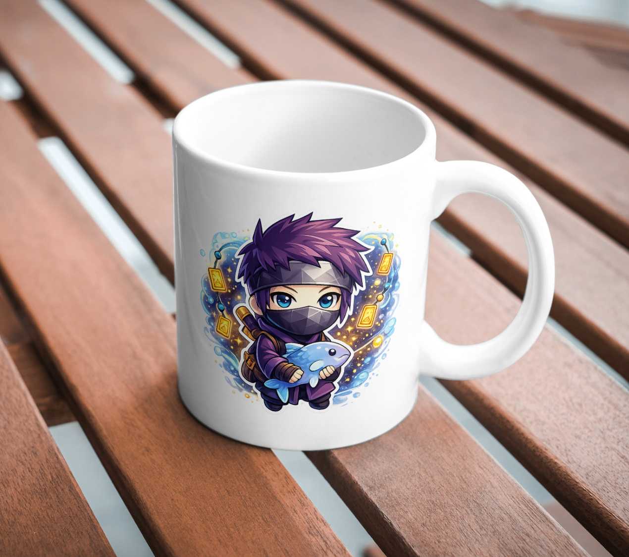 A cute ceramic coffee mug featuring an anime ninja character holding a dolphin with magical effects.