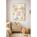 This safari animals illustration brings a friendly world to life with soft smiles, warm colors, and calm harmony. Featuring a lion, elephant, giraffe, and zebra, the scene feels playful yet soothing, designed to spark imagination without overstimulation. It’s cheerful without noise, decorative without clutter. Perfect for creating a welcoming, comforting atmosphere in children’s spaces while keeping a clean, modern aesthetic.