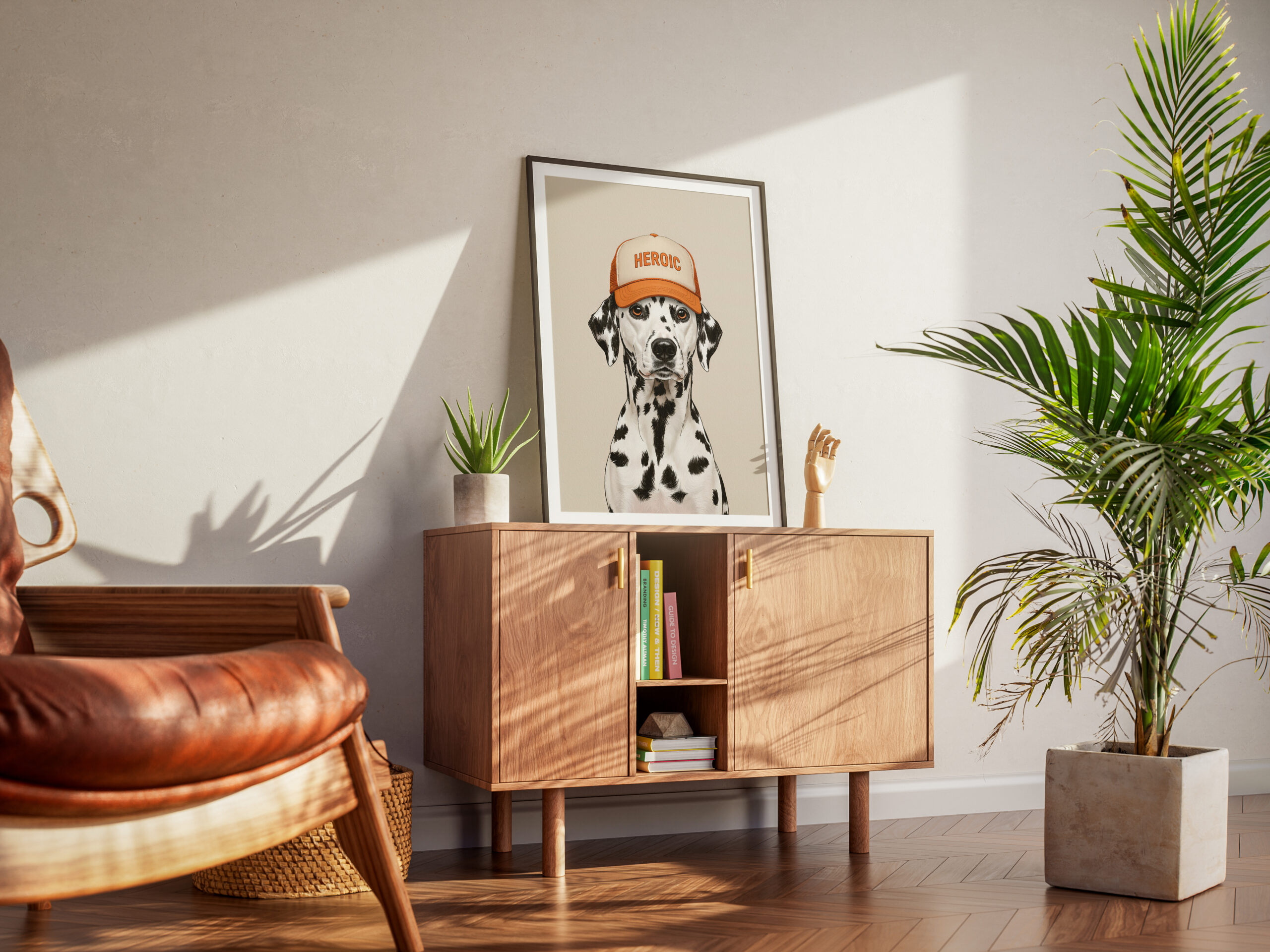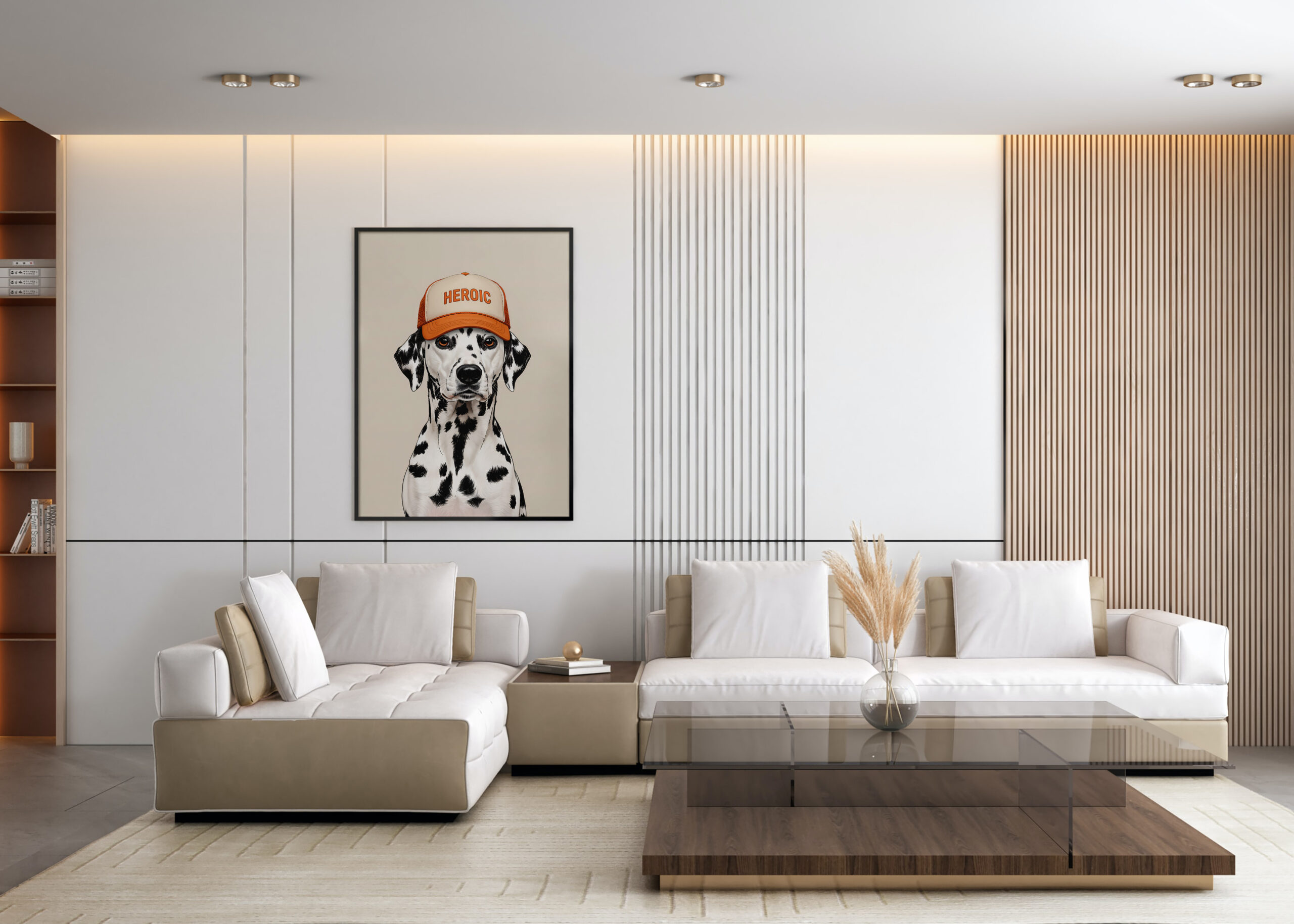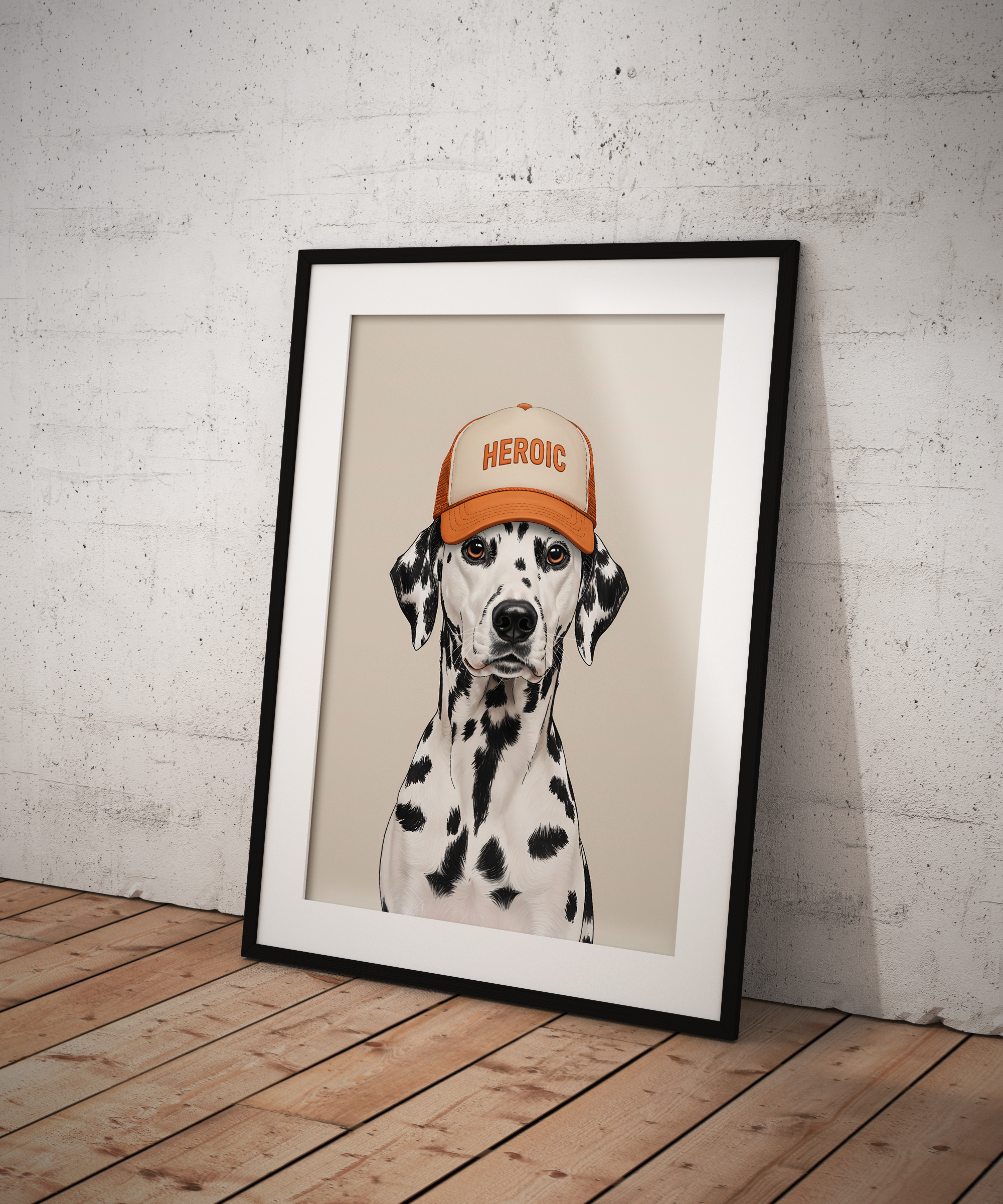 Add a bold statement to your space with this eye-catching digital wall art featuring a heroic Dalmatian wearing an orange cap labeled “HEROIC.” Perfect for dog lovers, modern pet-themed nurseries, or eclectic home decor. This printable artwork brings charm and character into any room!