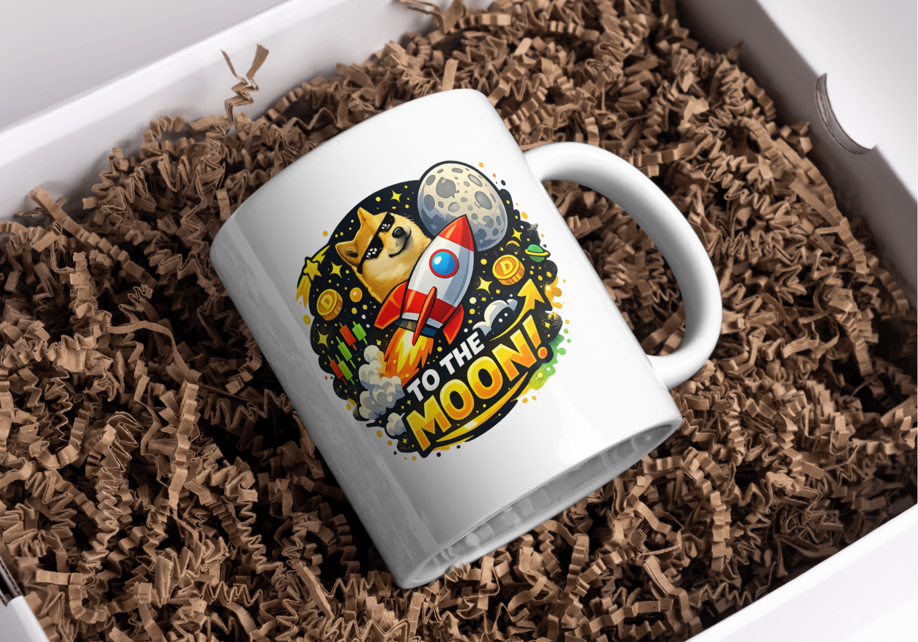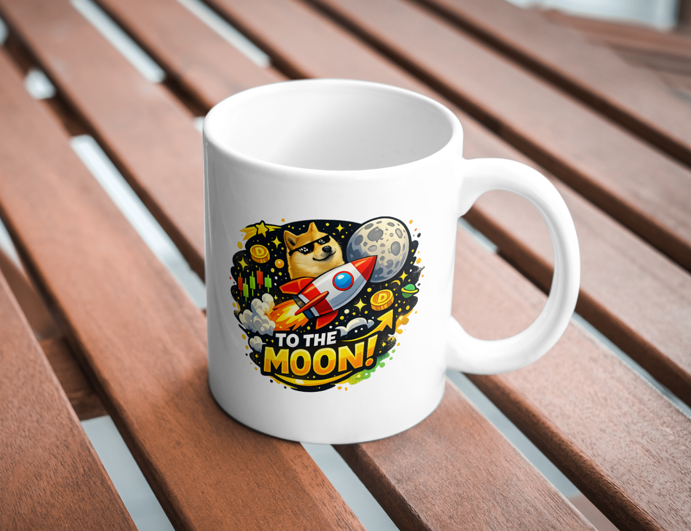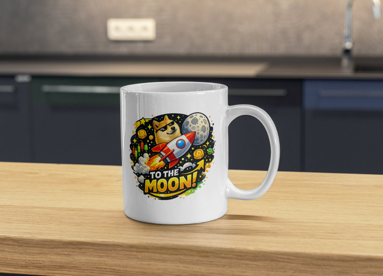 This fun and iconic mug features a doge-themed rocket blasting toward the moon, surrounded by charts, coins, and stars. A tribute to meme culture and crypto optimism.