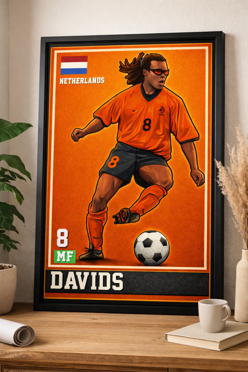 Aggression with intelligence. Chaos with purpose. This premium football artwork captures Edgar Davids in Netherlands orange, number 8 on his chest, mid-stride and fully engaged. Low center of gravity, eyes locked, body coiled. This is a midfielder built to disrupt everything.