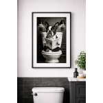 Serious business, no interruptions. This funny dog wall art print features a stoic bulldog seated on a toilet, calmly reading a newspaper in a minimalist, high-contrast bathroom setting. Rendered in dramatic black and white with controlled lighting and symmetry, the humor is dry, deliberate, and unmistakably confident.