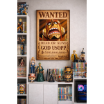 This vintage-style Wanted poster artwork features Usopp, elevated from habitual liar to divine symbol of chaos under the name God Usopp. Captured mid-scream with wide eyes, battle scars, and raw emotion, this piece freezes the exact moment cowardice mutates into myth.