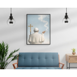 This surreal satire wall art print blends classic religious iconography with a modern, quietly rebellious gesture. A figure in ceremonial white holds a cross and a cigarette, framed against an open sky. It’s minimal, symbolic, and intentionally provocative without turning into cheap shock.
